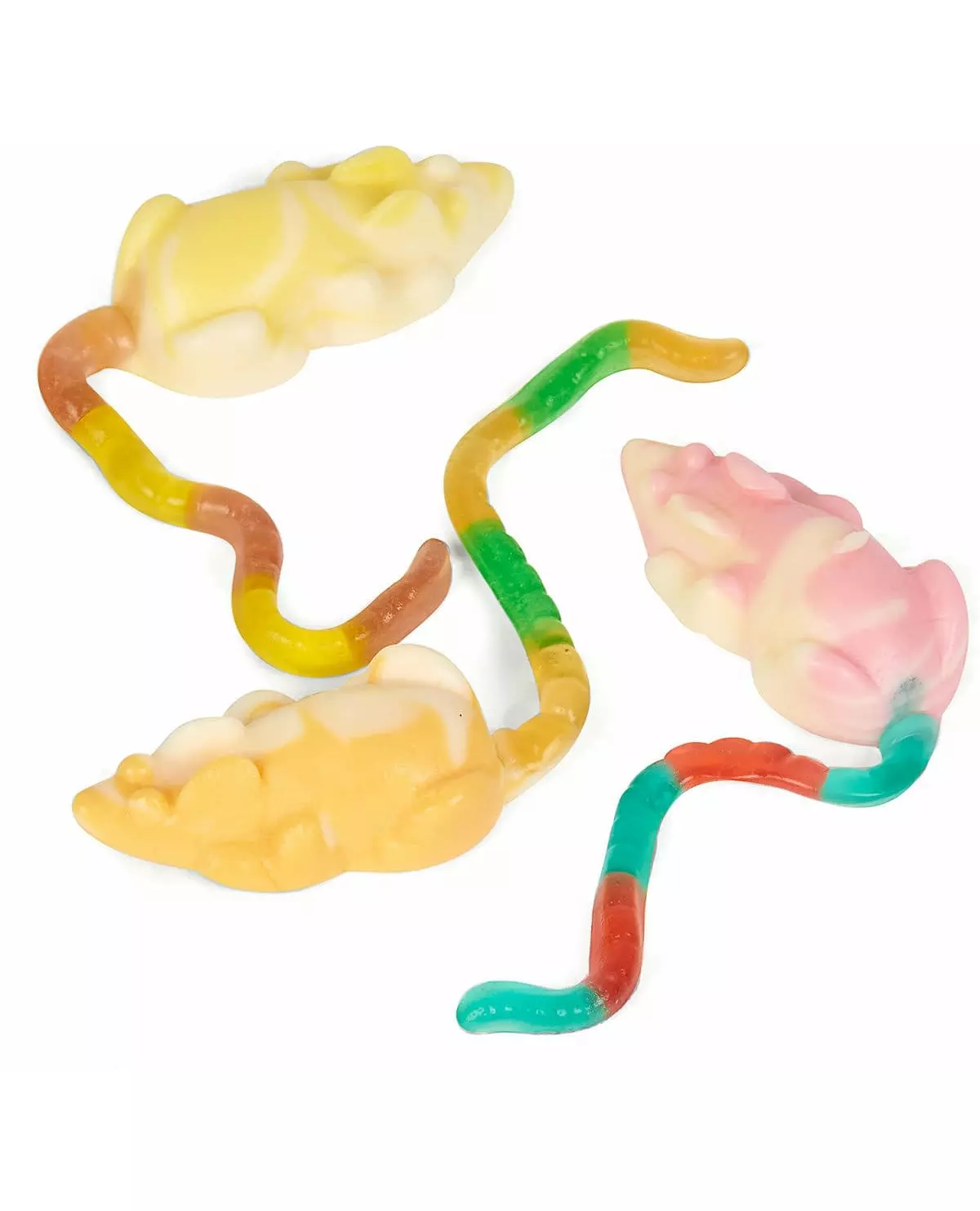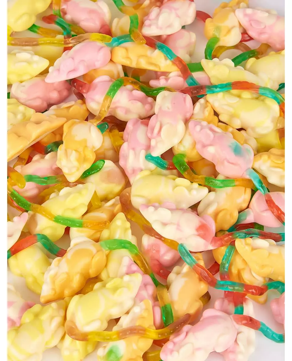 kg glede til festen din! Denne posen inneholder 1 kg godteri. Disse godteriene er museformede og tilgjengelige i en rekke farger. Kroppen er matt og halen er laget av gjennomsiktig gelé. Disse søte gnagerne vil være en hit på temafesten din, som for eksempel Halloween, til spiselig dekorasjon eller selvbetjening. Ingredienser: Glukosesirup, sukker, gelatin, surhetsregulerende midler: sitronsyre og melkesyre, geleringsmiddel: pektin, aromaer, fargestoffer: E104, E110, E120, E129, E131, vegetabilsk olje, slippmiddel: bivoks, karnaubavoks. Inkludert tilbehør: 1 x 1 kg pose