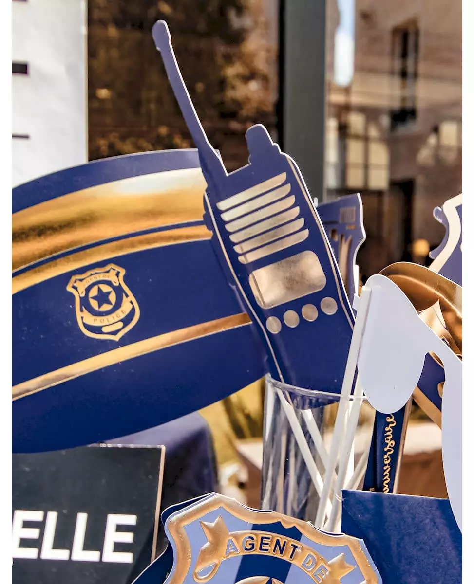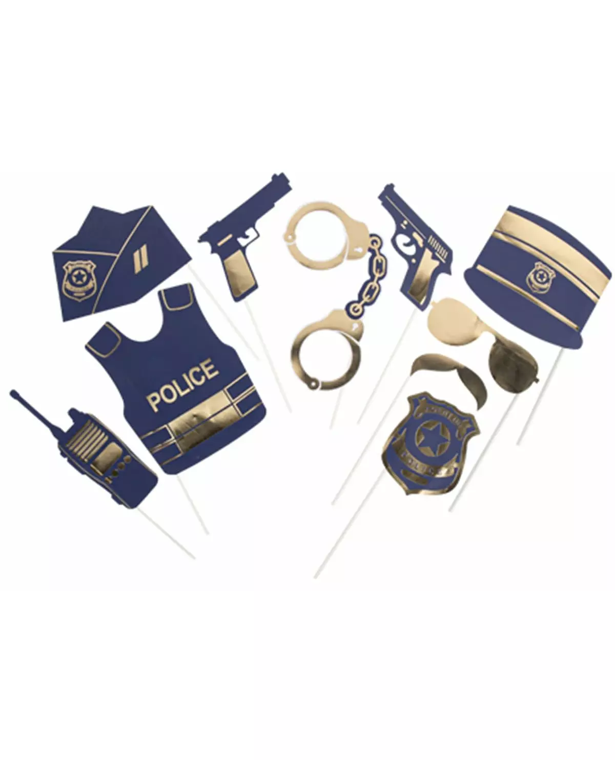 Sett deg inn i rollen som politibetjent for noen bilder! Dette tilbehøret til politiets fotoboks selges i sett på 10 stk. De representerer en walkie-talkie, en caps, en skuddsikker vest, to pistoler, et par håndjern, en caps, et par briller, en bart og et merke. Dette fotobokssettet i marineblå og gulltoner vil være perfekt for å ta originale bilder på en politifest! Inkludert tilbehør: 10 fotobokstilbehør