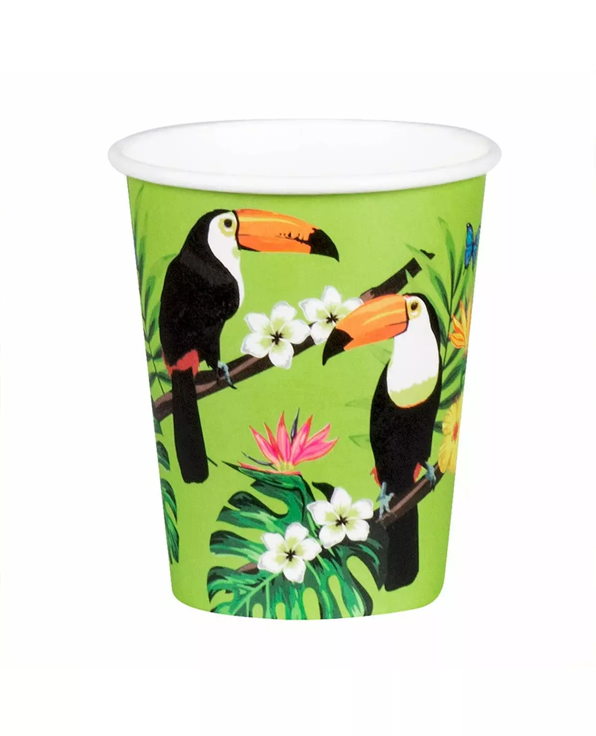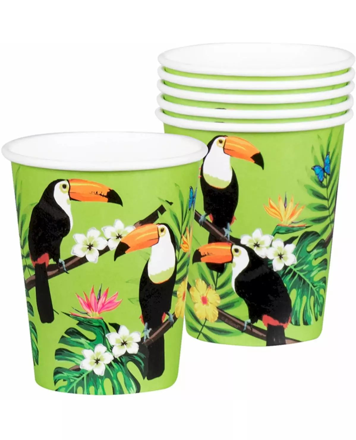 Tropiske drinker med tukaner! Disse koppene selges i pakker på 10 stk. De er laget av papp, grønne og dekorert med tukaner med tropiske blomster og blader. Kapasiteten er omtrent 21 cl. Fullfør det tropiske temabordet ditt på en hawaiisk fest med disse tukankoppene! Inkludert tilbehør: 10 kopper Materiale: Papp