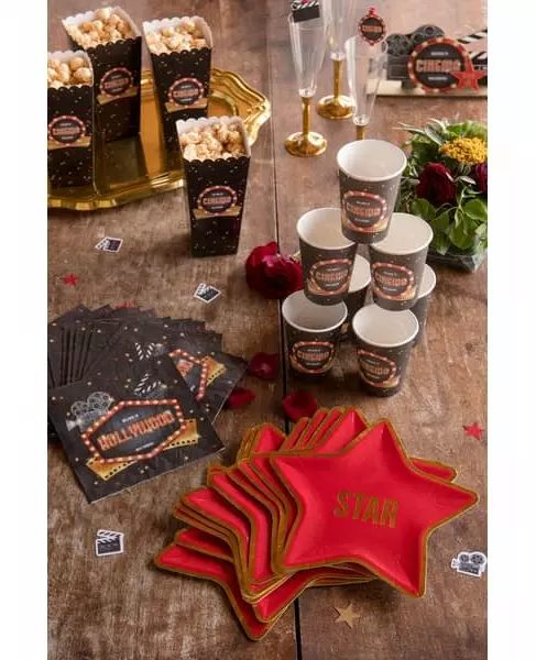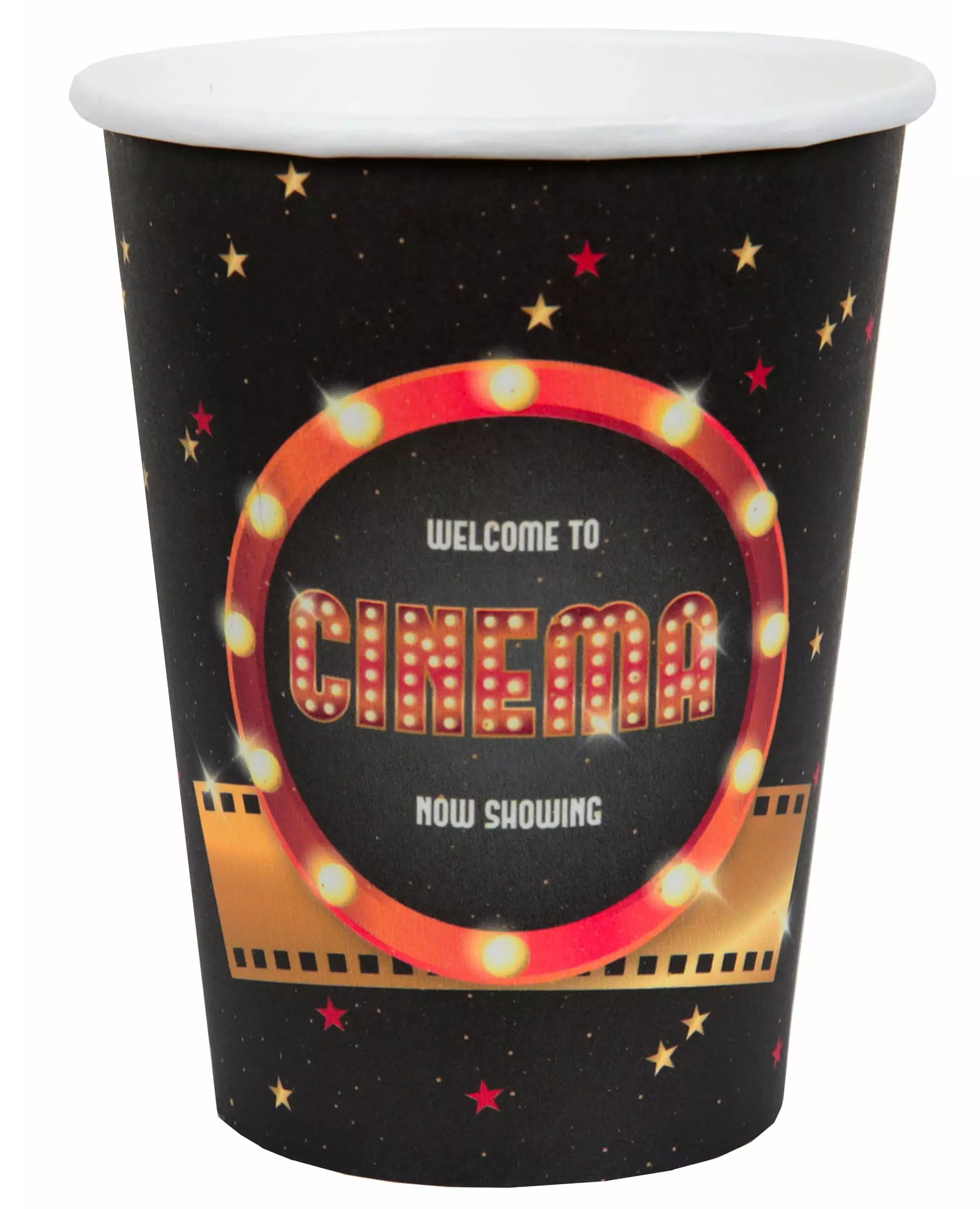 Bli festens stjerne! Disse 10 pappkrusene måler omtrent 7,8 x 9,7 cm. De er svarte med gull- og røde stjerner. Den opplyste inskripsjonen «Velkommen til kino» vises i grått og rødt. Den er omgitt av en rund rød ramme dekorert med små lys. En gullfilm pryder bunnen av koppen, som minner om kinotemaet. Disse koppene vil være stjernene på borddekorasjonen din til en bursdagsfest med kinotema! Inkludert tilbehør: 10 kopper Materiale: Papp