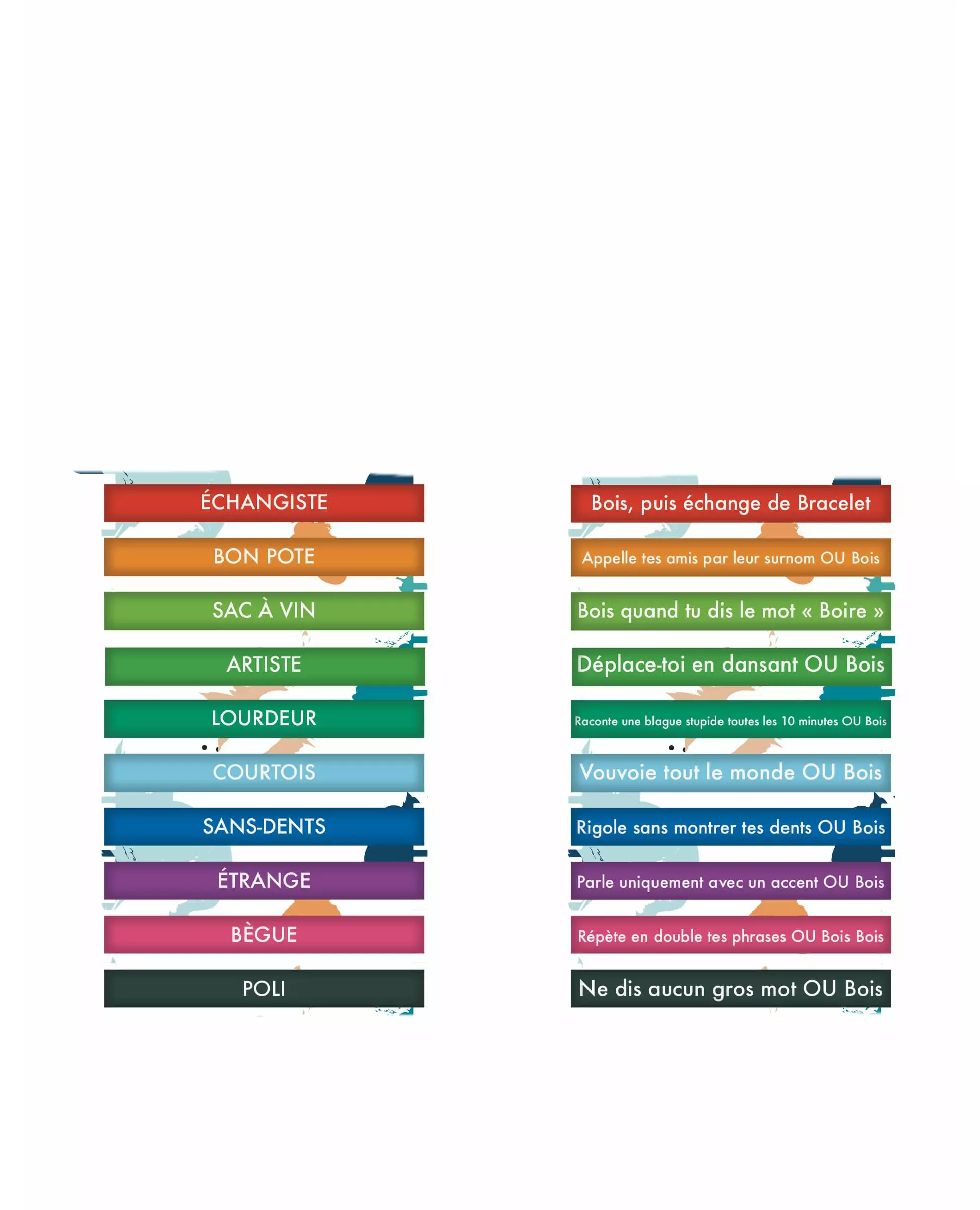 Respekter løftet eller drikk! Dette settet består av 10 flerfargede silikonarmbånd. På toppen finner du adjektiver som kan definere vennene dine, med en humoristisk utfordring som «ikke si noen stygge ord eller drikk», «beveg deg mens du danser eller drikk»... Du kan utfordre vennene dine ved å ganske enkelt dele ut armbåndene til dem, eller ved å plassere dem rundt glasset deres når de er vendt ryggen til. Disse armbåndene vil være perfekte for å live opp kvelden med venner. Inkludert tilbehør: 10 armbånd Materiale: Plast
