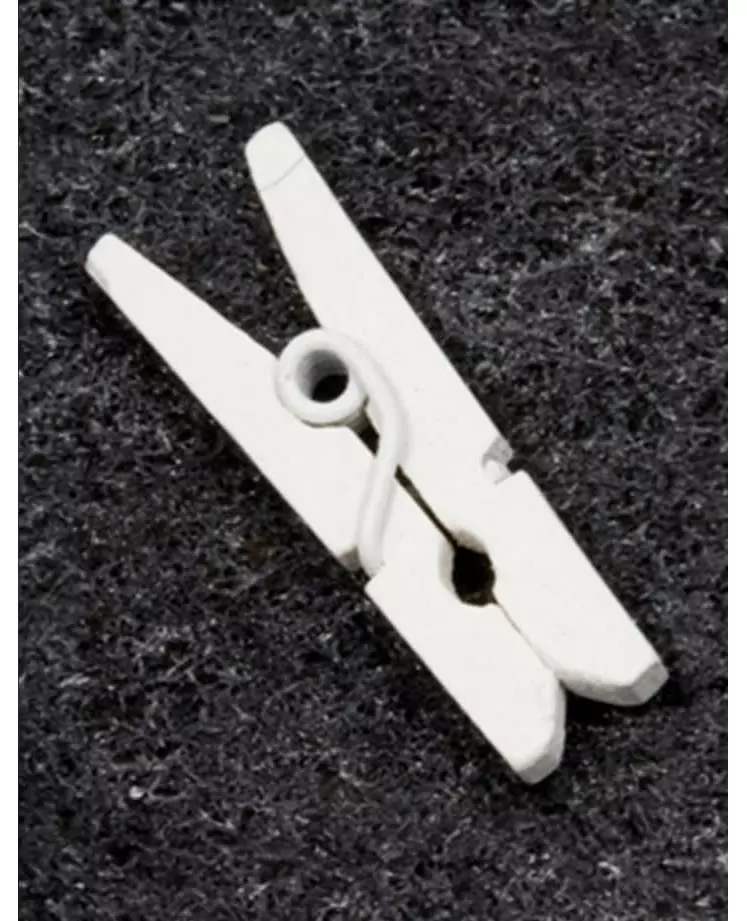 10 mini hvite klesklyper i tre, 2,5 cm. Denne pakken består av 10 mini hvite klesklyper i tre som måler 2,5 cm lange og 2 mm brede.