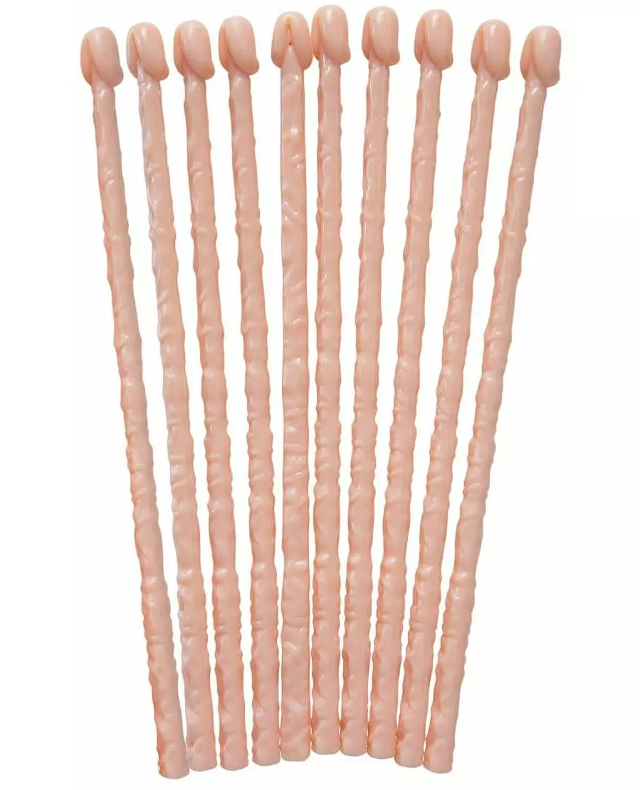 Pakke med 10! Denne pakken inneholder 10 penisformede rørepinner i plast. Hver rørepinn måler omtrent 11 cm. Disse produktene kan vaskes i maskin og kan brukes om igjen. De vil være ideelle for et utdrikningslag. Copyright Widmann SRL. Inkludert tilbehør: 10 rørepinner