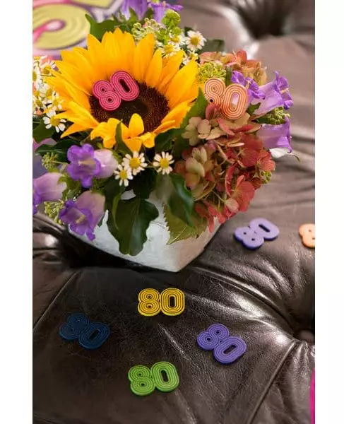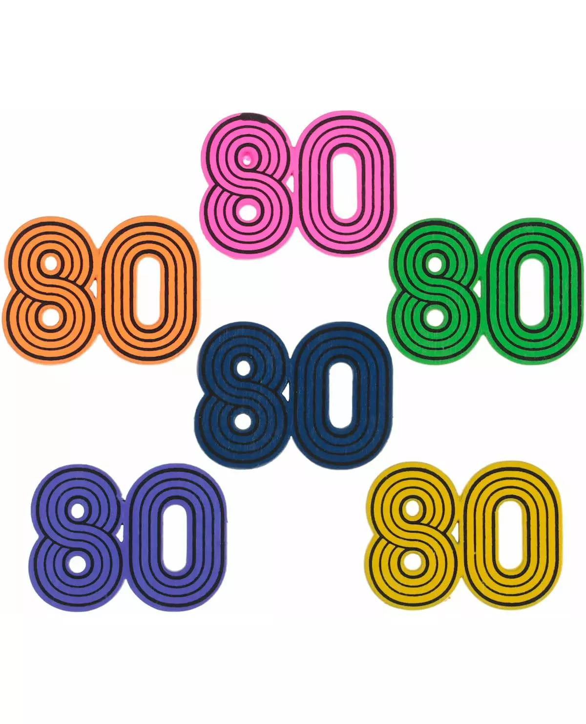80-tallet er tilbake! Disse 10 bordkonfettiene måler omtrent 3 x 3 cm. De representerer tallet «80» og har flere farger, noen er oransje, andre er gule, rosa, blå, grønne og lilla. Disse konfettiene er laget av tre. Disse bordkonfettiene vil ta deg tilbake til 80-tallet for en temafest eller bursdag! Inkludert tilbehør: 10 konfetti Materiale: Tre