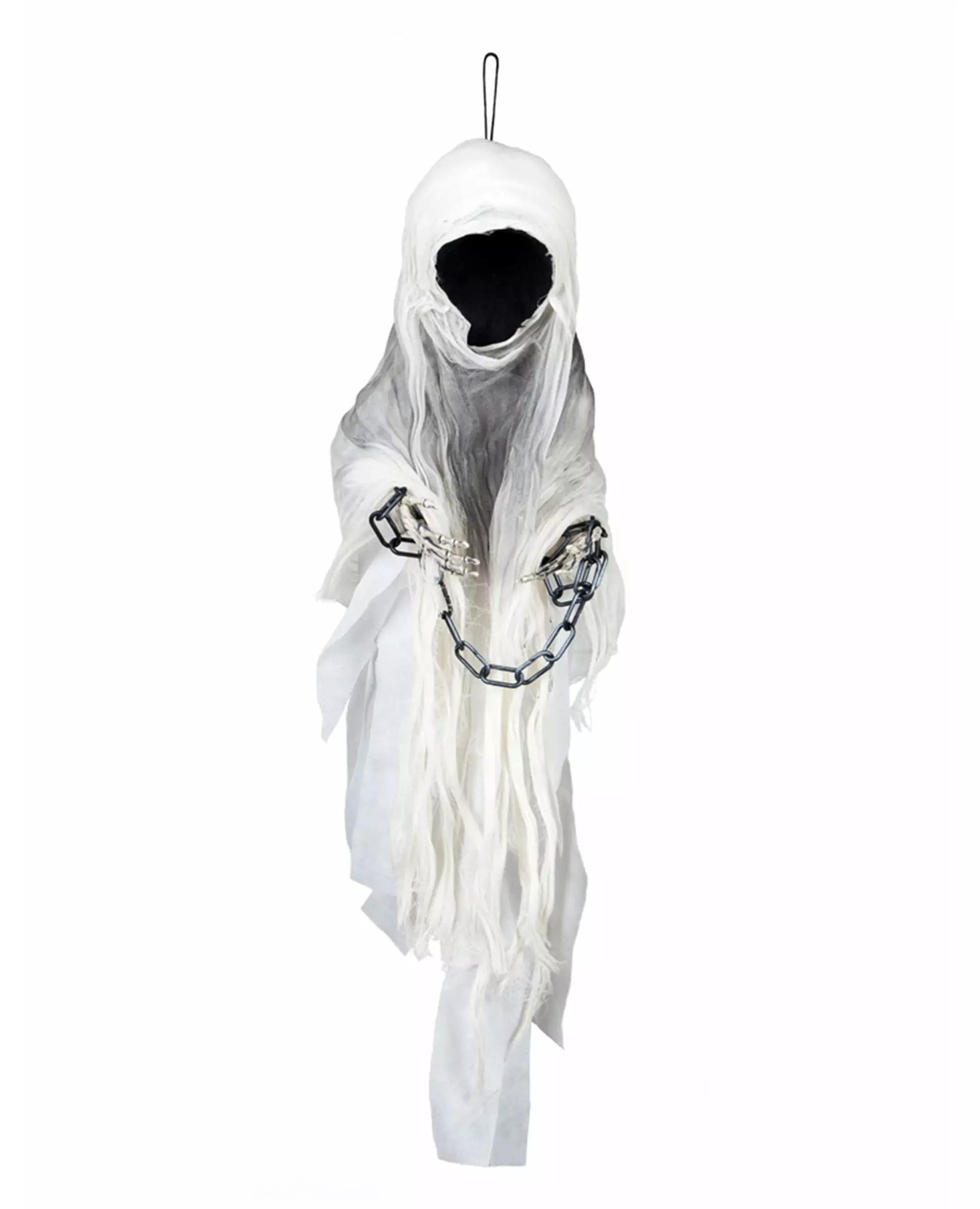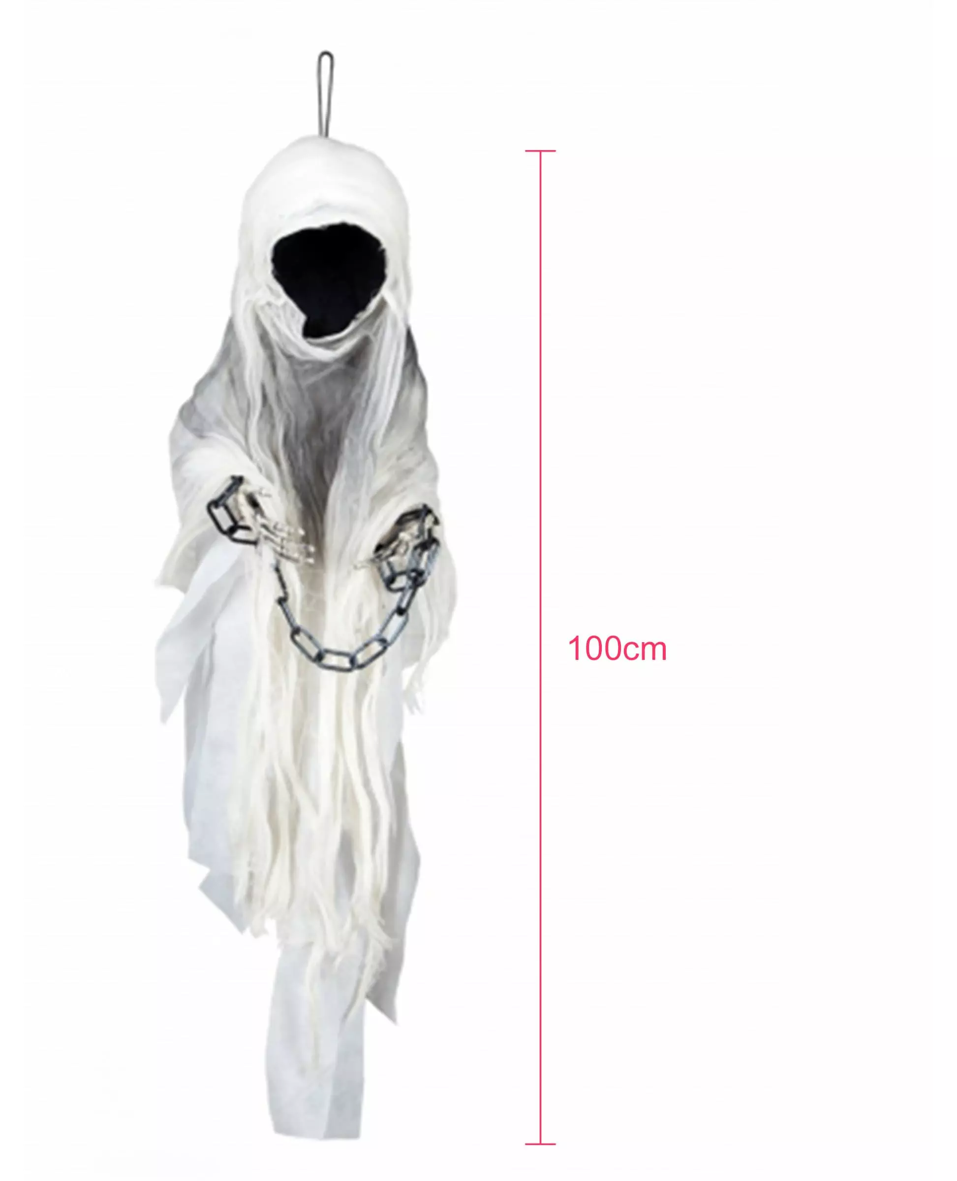 Fordyp gjestene dine i en skremmende verden! Denne Halloween-dekorasjonen forestiller et skjelett fra en mann med ljåen. Denne dekorasjonen måler omtrent 100 cm i lengden. Hodet er laget av polystyren, og kroppen og armene er avtakbare. Skjeletthender og en plastkjede er til stede. Hele dekorasjonen er dekket med hvitt og elfenbensfarget stoff og slør. Du kan enkelt henge denne dekorasjonen med en svart snor som er festet på hodet. Heng dette spøkelset fra inngangen til huset ditt for å ønske vennene dine velkommen på Halloween-kvelden. Inkludert tilbehør: Spøkelsesdekorasjon Materiale: Stoff, polystyren