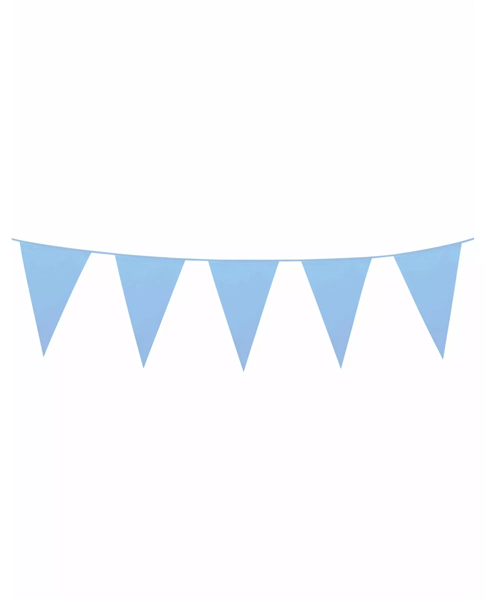 En vakker girlander av gigantiske vimpler! Denne dekorative girlanderen av gigantiske vimpler måler omtrent 10 meter lang. Den inkluderer 18 himmelblå vimpler. Disse 46 x 30 cm vimplene er laget av plast, noe som gjør at de kan henges utendørs eller innendørs. Denne vimpelgirlanderen vil være ideell for dekorasjon når en nyfødt kommer eller til en sommerfest! Inkludert tilbehør: en girlander Materiale: Plast