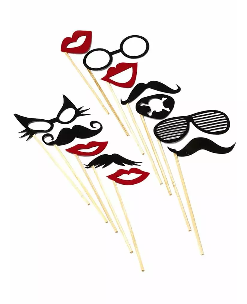 Ta flotte bilder! Dette fotobokssettet inneholder 12 pappbrikker. Du finner: - 4 røde munner - 4 svarte barter - 3 par svarte briller: et par runde briller, et par shutter-briller og et par katteøynebriller. - En svart pirat-øyelapp. Hvert element er festet til en trepinne som er omtrent 17 cm høy. Ta bilder med dette settet og behold uforglemmelige minner fra bryllupet eller bursdagen din. Inkludert tilbehør: 12 fotobokstilbehør Materiale: Papir
