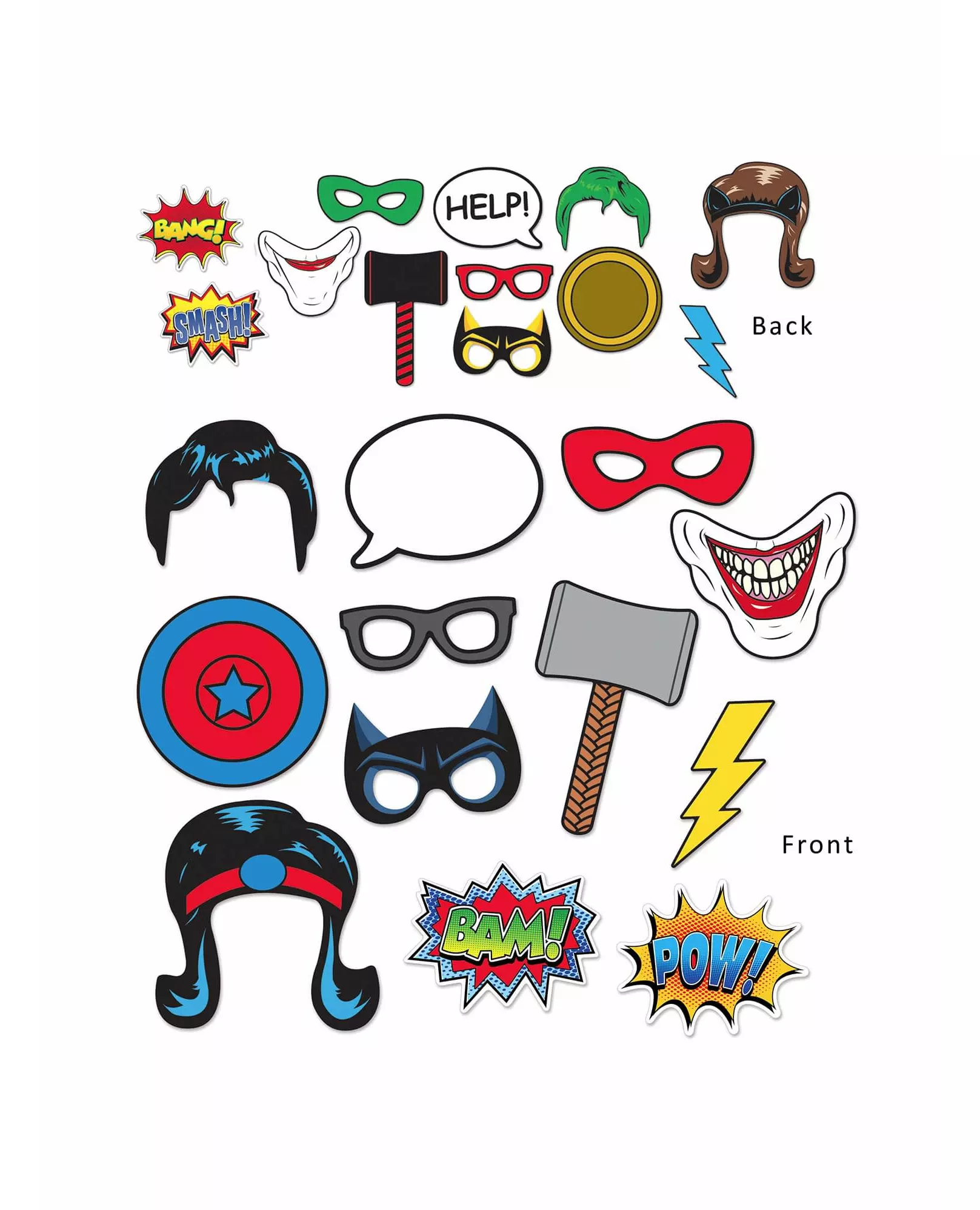 Perfekt for en morsom fotoseanse! Dette settet inneholder 12 rekvisitter til superhelt-fotoboksen. De er laget av papp og inneholder: et par briller, en Batman-maske, en hammer, en mannsparykk, en jokermunn, en ulvemaske, en superhelt-kvinneparykk, et skjold, et lyn, 2 snakkebobler og 1 tilpassbar boble. Hver del er trykt i forskjellige farger på forsiden og baksiden. De måler mellom 15 og 25 cm, avhengig av modellen. Dette settet vil være perfekt for å pynte opp bildene dine og for å kamuflere gjestene dine under en superhelt-temafest! Inkludert tilbehør: 12 rekvisitter til fotoboksen. Materiale: Papp.
