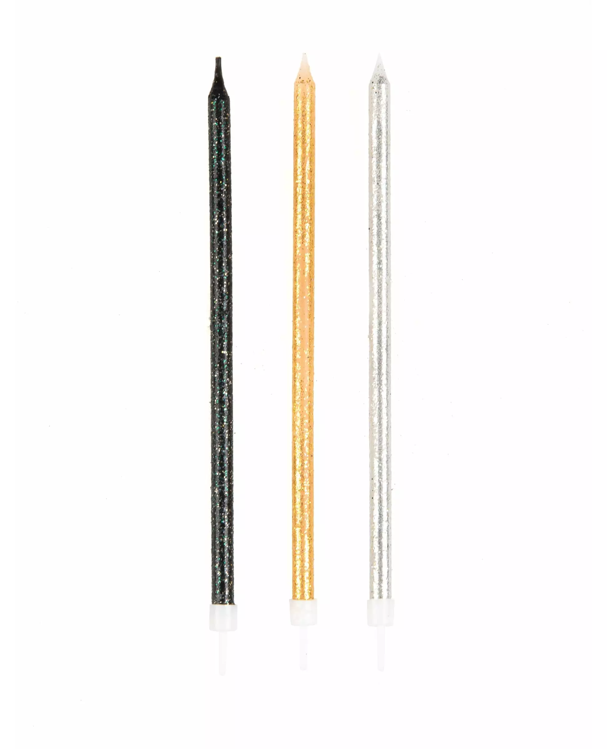 12 store glitterlys i svart, gull og grått, 15 cm. Stilige lys til bursdagskaken din. Disse store lysene selges i pakker på 12.