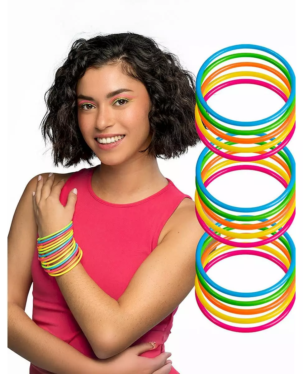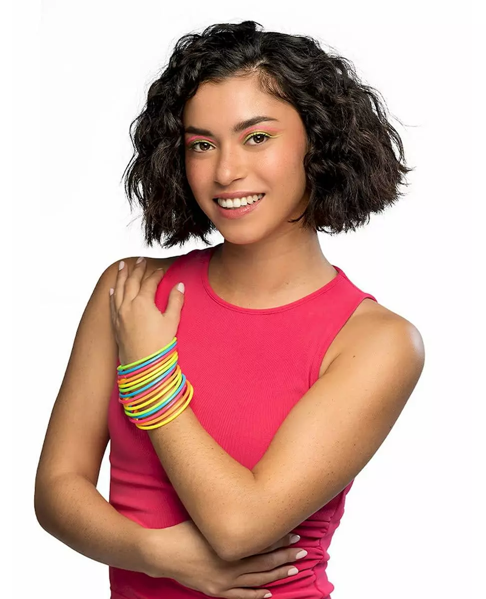 Legg til litt farge i 80-tallsantrekket ditt. Dette settet består av 15 flerfargede armbånd. Disse er laget av stiv plast. De kommer i forskjellige farger (nemlig gul, rosa, grønn, lyseblå, mørkeblå og oransje) og måler omtrent 6,5 cm i diameter. Disse armbåndene vil pynte opp 80-tallsantrekkene dine på en fin måte under kostymefester med venner. Inkludert tilbehør: 15 armbånd. Materiale: Plast.