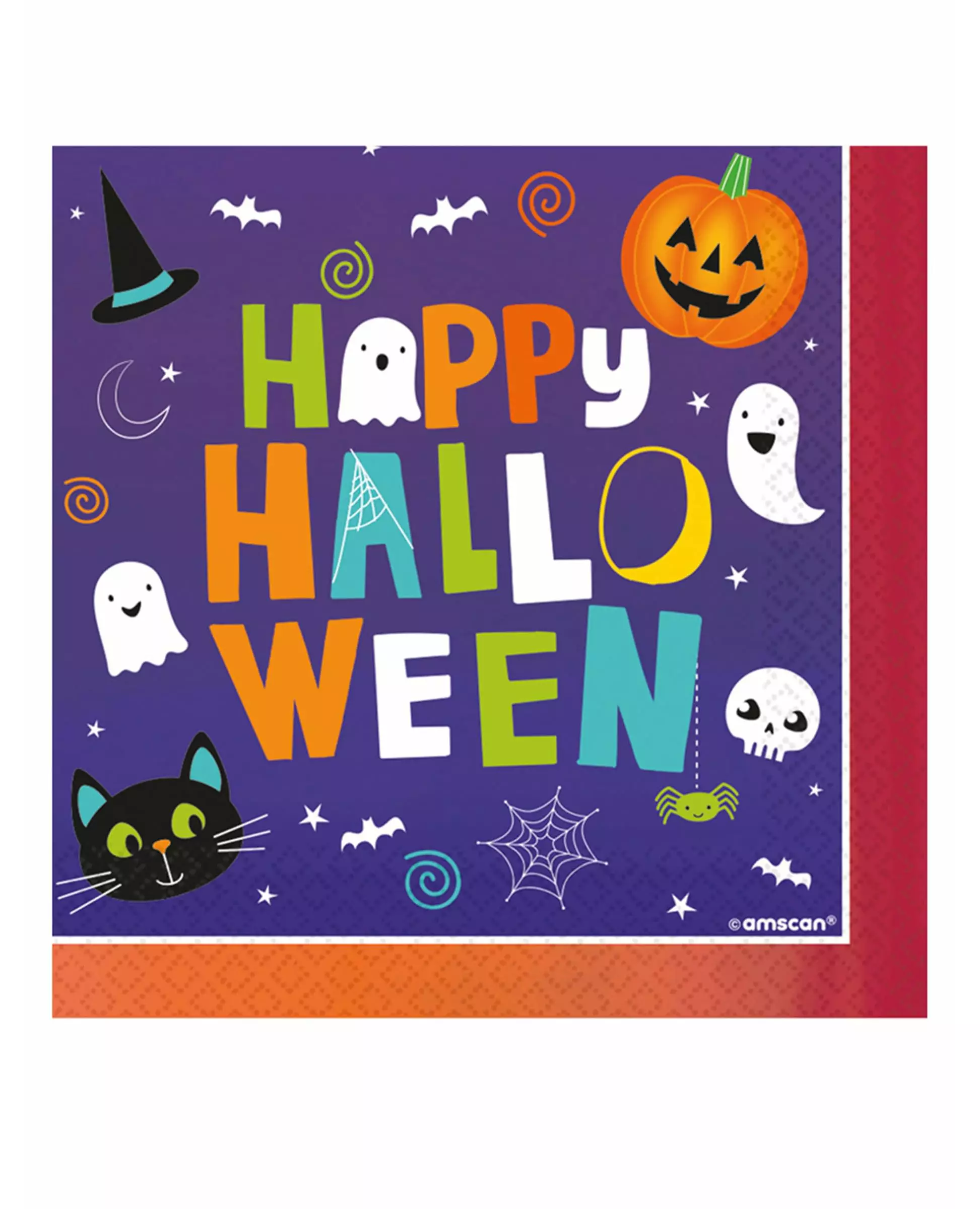 Disse serviettene ønsker deg en god Halloween! Denne pakken inneholder 16 Halloween Friends-papirservietter. De er lilla med røde og oransje kanter. I midten har de påskriften «God Halloween» omgitt av søte Halloween-tema-design som en svart katt, spøkelser, et gresskar og flaggermus. De måler omtrent 33 x 33 cm når de er utbrettet. Disse Halloween Friends-papirserviettene vil være perfekte for å organisere en Halloween-fest! Inkludert tilbehør: 16 servietter Materiale: Papir