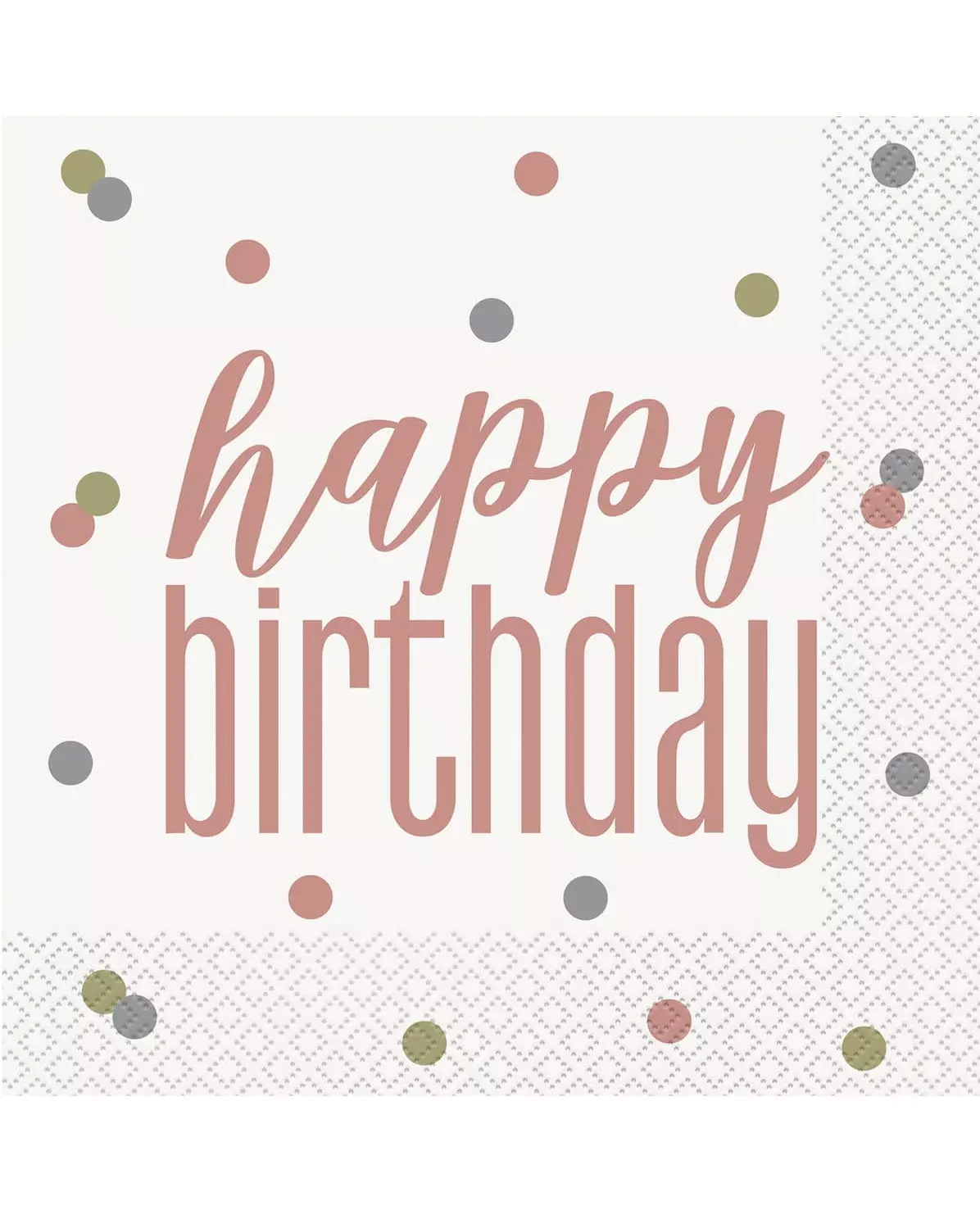 16 hvite og roségull bursdagspapirservietter 33 x 33 cm