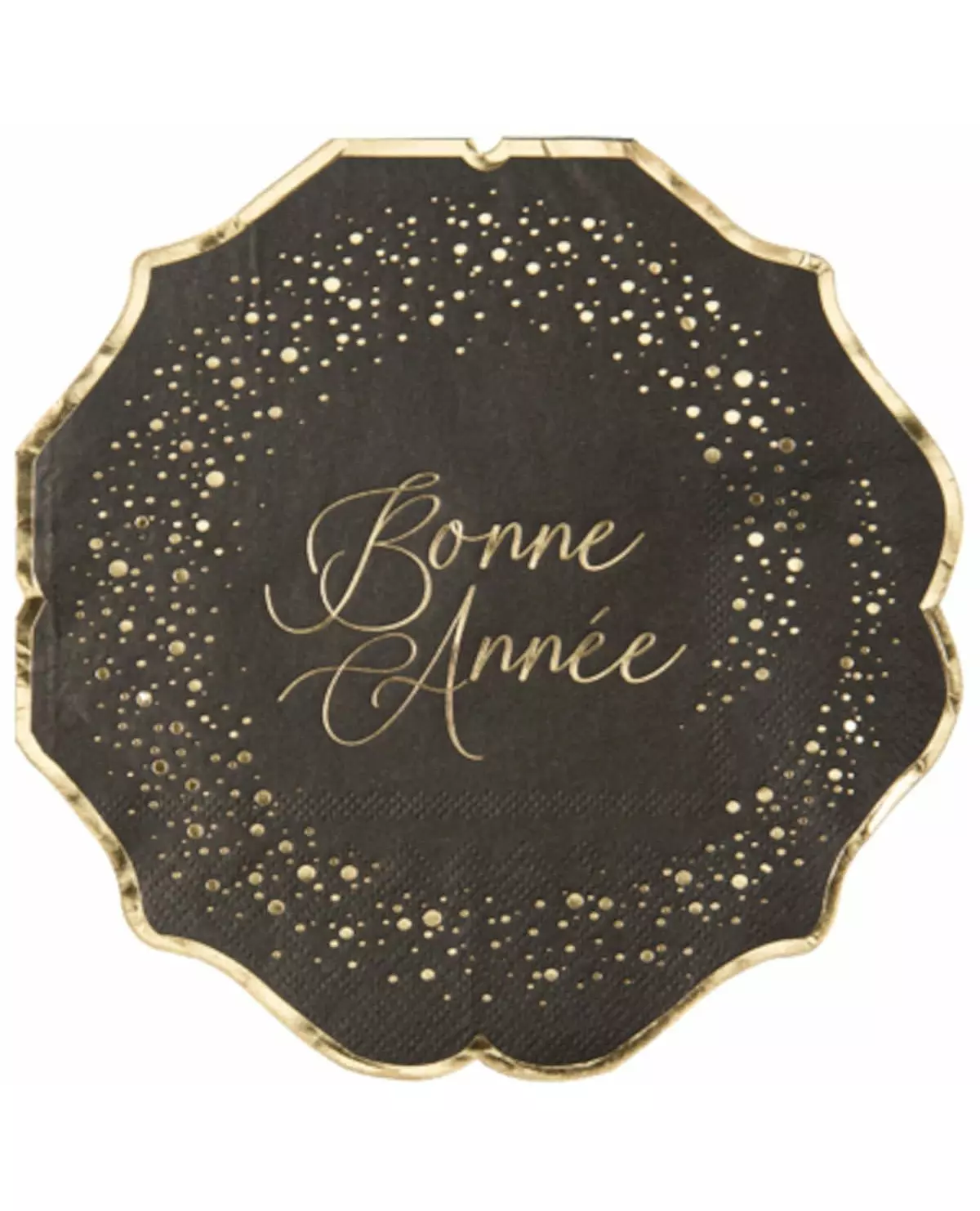 16 svarte og gullfargede papirservietter med motivet «Godt nyttår», 33 x 33 cm