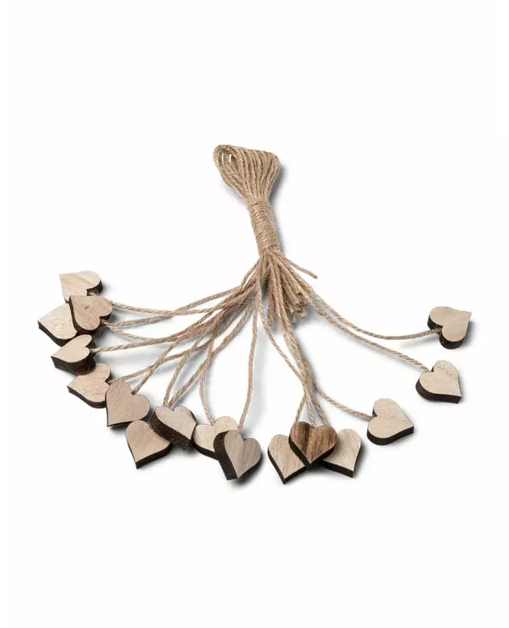 En naturlig dekorasjon Dette settet består av 16 små trehjerter med tilhørende snor. Hjertene måler omtrent 2 x 2 x 0,7 cm. De kan enkelt henges opp takket være den medfølgende snoren. Disse små hjertene vil være perfekte for å fullføre bryllupsdekorasjonen din. Inkludert tilbehør: Sett med 16 hjerter Materiale: Tre