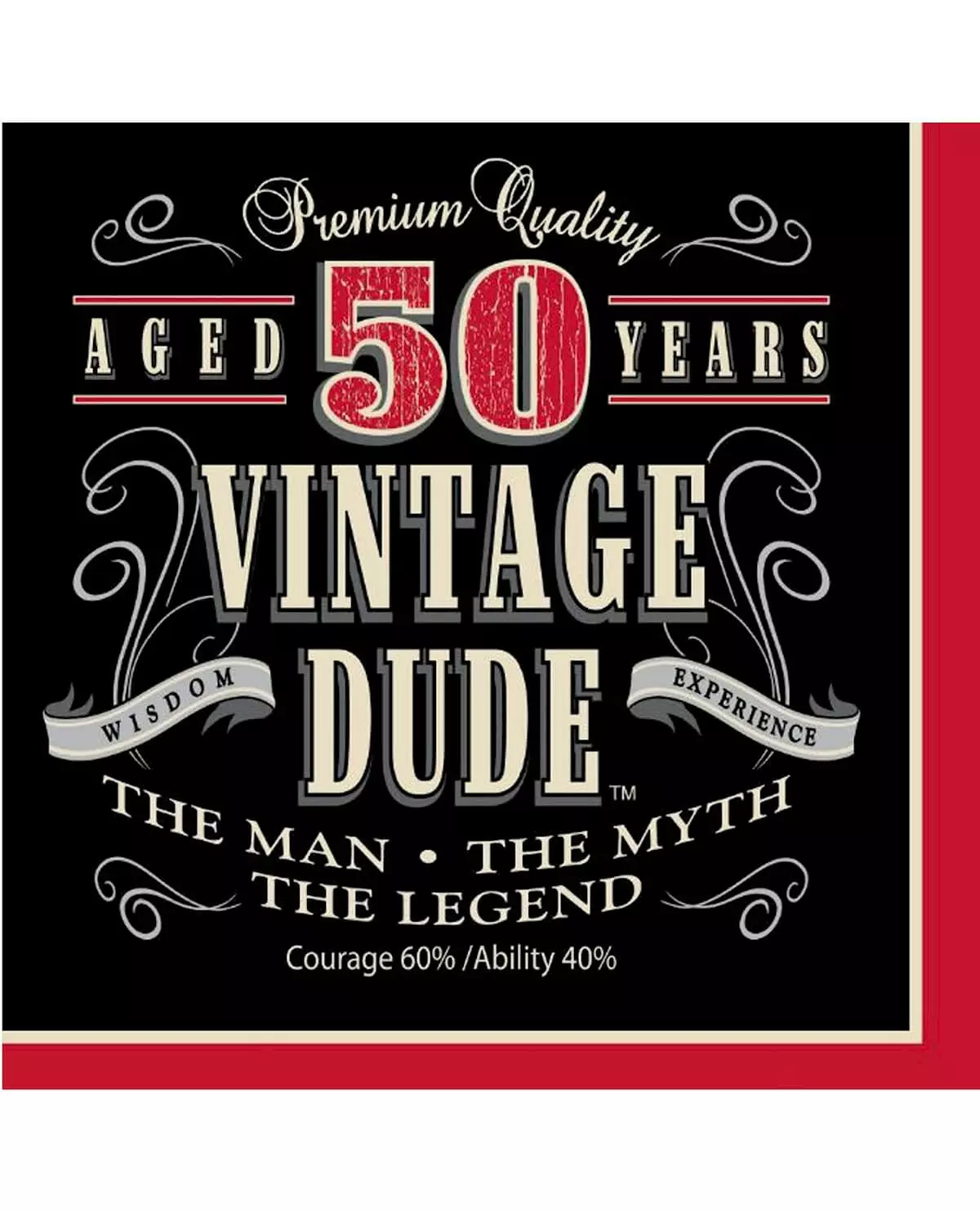 En borddekorasjon i saloon-stil! Disse vintage papirserviettene til 50-årsdagen selges i pakker på 16. De er 33 x 33 cm firkantede og er svarte med en rød kant. De er trykket med meldingene «AGED 50 YEARS VINTAGE DUDE» og «THE MAN THE MYTH THE LEGEND» i beige bokstaver. Disse ordene refererer til kveldens mann: din lenge etterlengtede femtiårsdag! Disse serviettene vil utfylle borddekorasjonen din perfekt, som vil annonsere temaet for 50-årsdagen til den mest fremtredende mannen! Inkludert tilbehør: 16 servietter Materiale: Papir