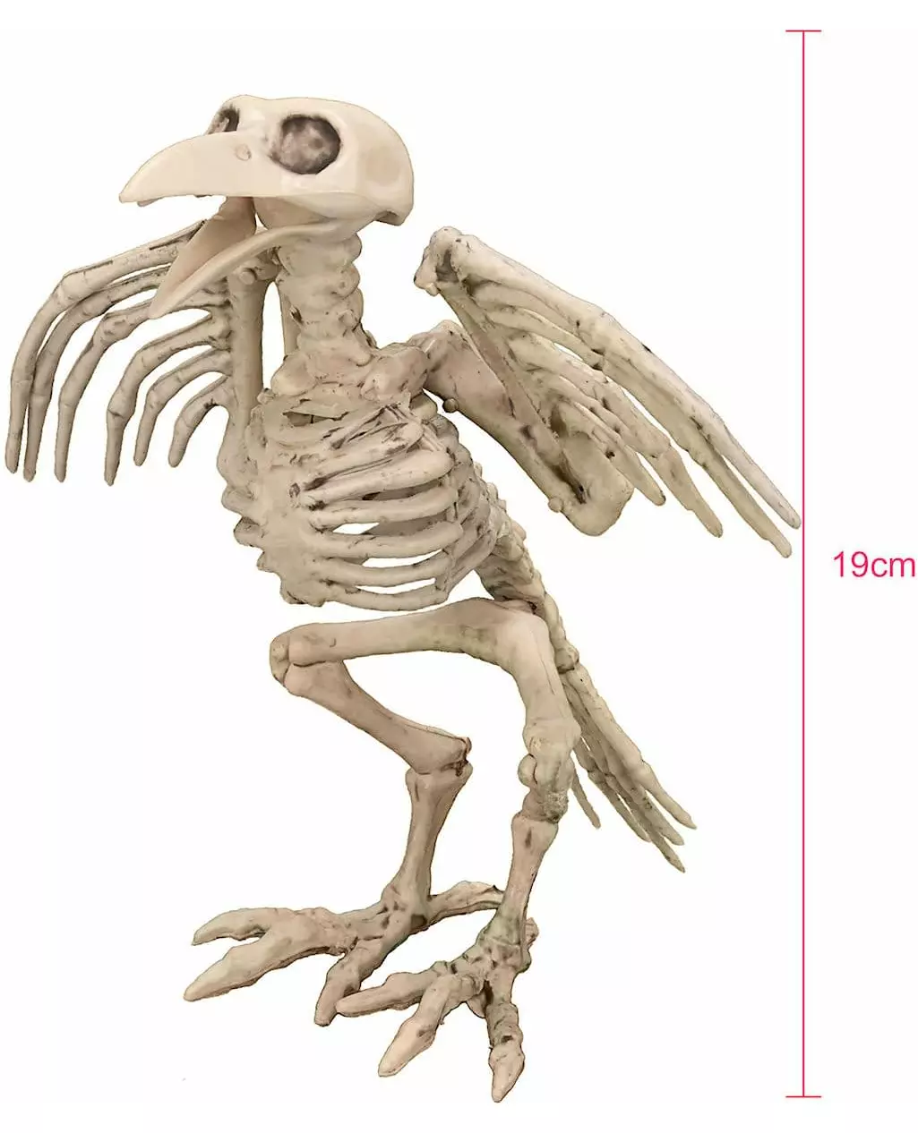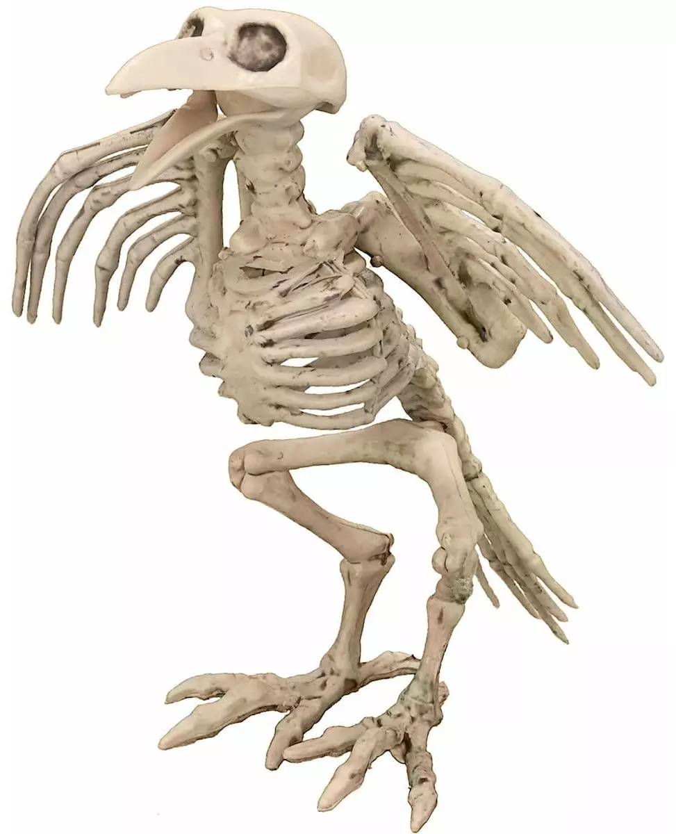 Skjelettdekorasjon! Denne dekorasjonen måler omtrent 19,5 cm i høyden og forestiller et kråkeskjelett av plast. Den er avtagbar, slik at du kan bevege nebbet, vingene og beina på dekorasjonen. Denne skjelettetkråken vil være ideell for å forbedre Halloween-borddekorasjonen din. Inkludert tilbehør: Dekorasjonsmateriale: Plast