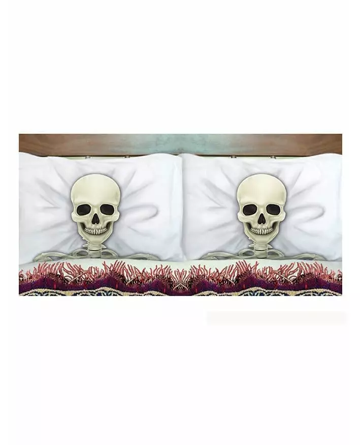 Forvandle hjemmet ditt til et hjemsøkt hus Dette settet består av to tynne putetrekk i plast. Hvert måler omtrent 53 x 81 cm. Forsiden har et skjeletttrykk, og baksiden er ensfarget hvit. Disse trekkene er åpne på siden for å gi plass til en pute. Disse skjeletttrekkene vil være perfekte for å fullføre hjemmedekorasjonen din på Halloween-kvelden. Inkludert tilbehør: 2 putetrekk Materiale: Plast