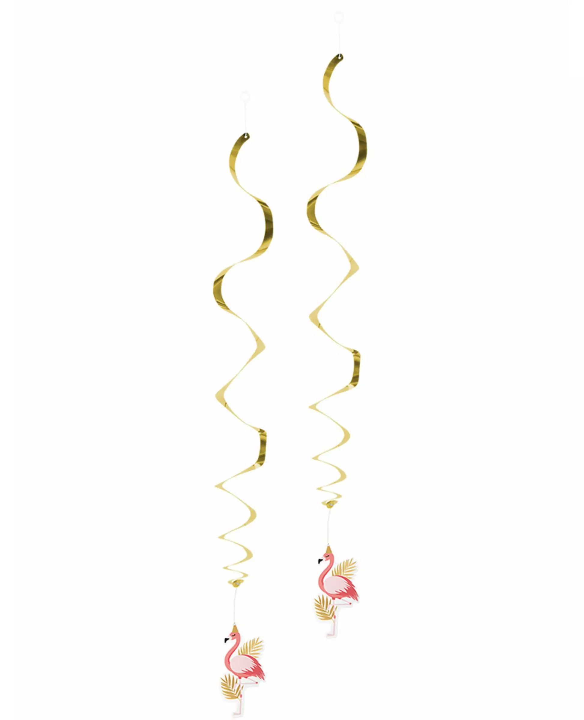 Hengende dekorasjoner til en flamingo-temafest! Disse to hengende dekorasjonene måler omtrent 85 cm i høyden. De er gullfargede plastspiraler som holder pappklistremerker som forestiller flamingoer. Disse spiralkleshengerne vil være ideelle dekorasjoner til din flamingo-temafest!. Inkludert tilbehør: 2 spiralkleshengere Materiale: Papp, Plast