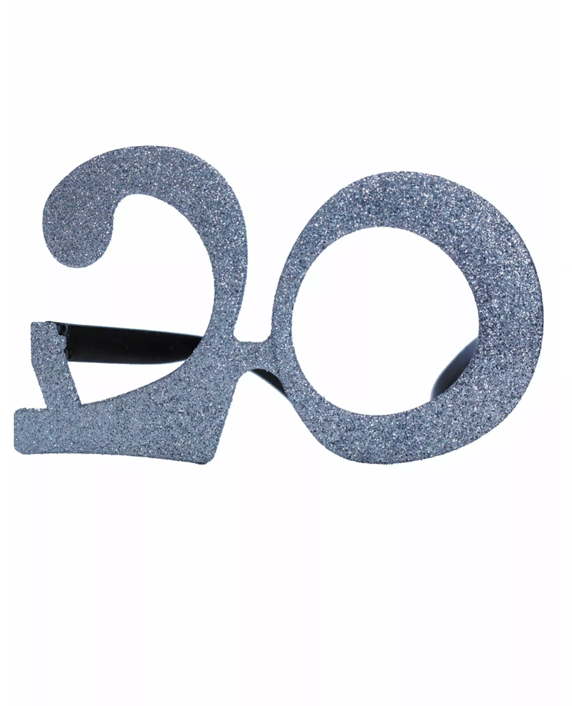 Gratulerer med dagen! Disse plastbrillene har tallet 20, en nikk til å fylle 20. Innfatningen er dekket av sølvglitter. Brillene måler omtrent 14 cm brede. De har ikke linser. Stengene er svarte og måler omtrent 13,5 cm lange. Dette tilbehøret vil være uunnværlig til 20-årsdagsfesten din! Inkludert tilbehør: Briller Materiale: Plast