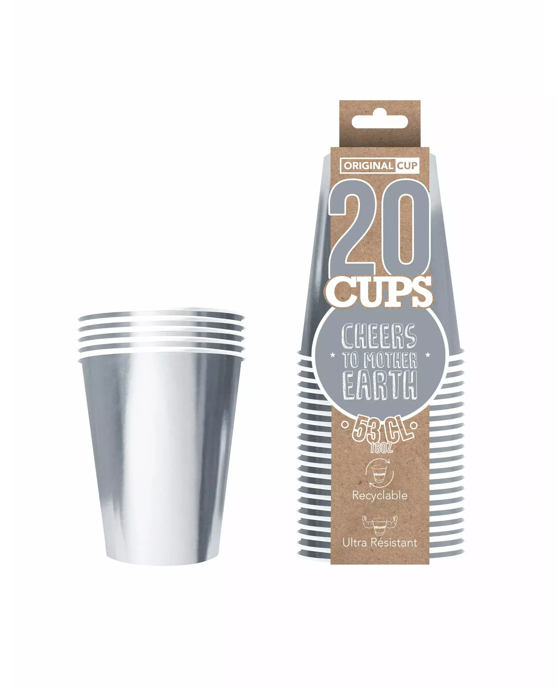 Få drinkene dine til å skinne med sølvkopper! Dette settet består av 20 gigantiske amerikanske kopper. De er svært slitesterke og laget av resirkulerbar sølvfarget papp. De har en kapasitet på omtrent 53 cl. Disse sølvkoppene vil være perfekte for en elegant kveld eller bursdag! Inkludert tilbehør: 20 kopper Materiale: Papp