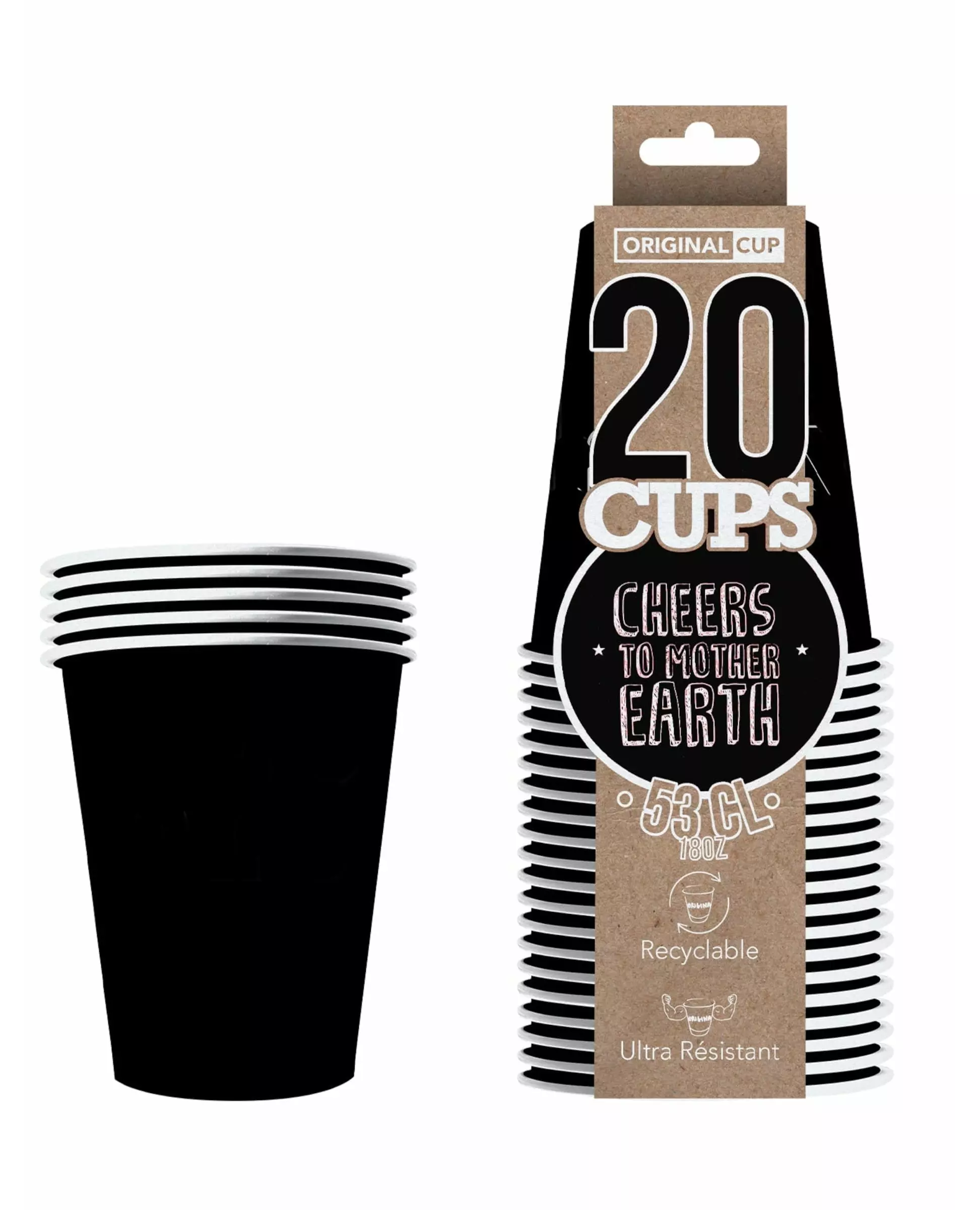 Svarte kopper for alle anledninger! Dette settet inneholder 20 svarte amerikanske kopper. De er laget av resirkulerbar papp og er svært slitesterke. De har en kapasitet på omtrent 53 cl. Hver kopp er trykket med ordene «Original Cup». Disse gigantiske koppene vil være perfekte for en svart-hvitt-fest, en bursdag eller enhver annen anledning! Inkludert tilbehør: 20 kopper Materiale: Papp