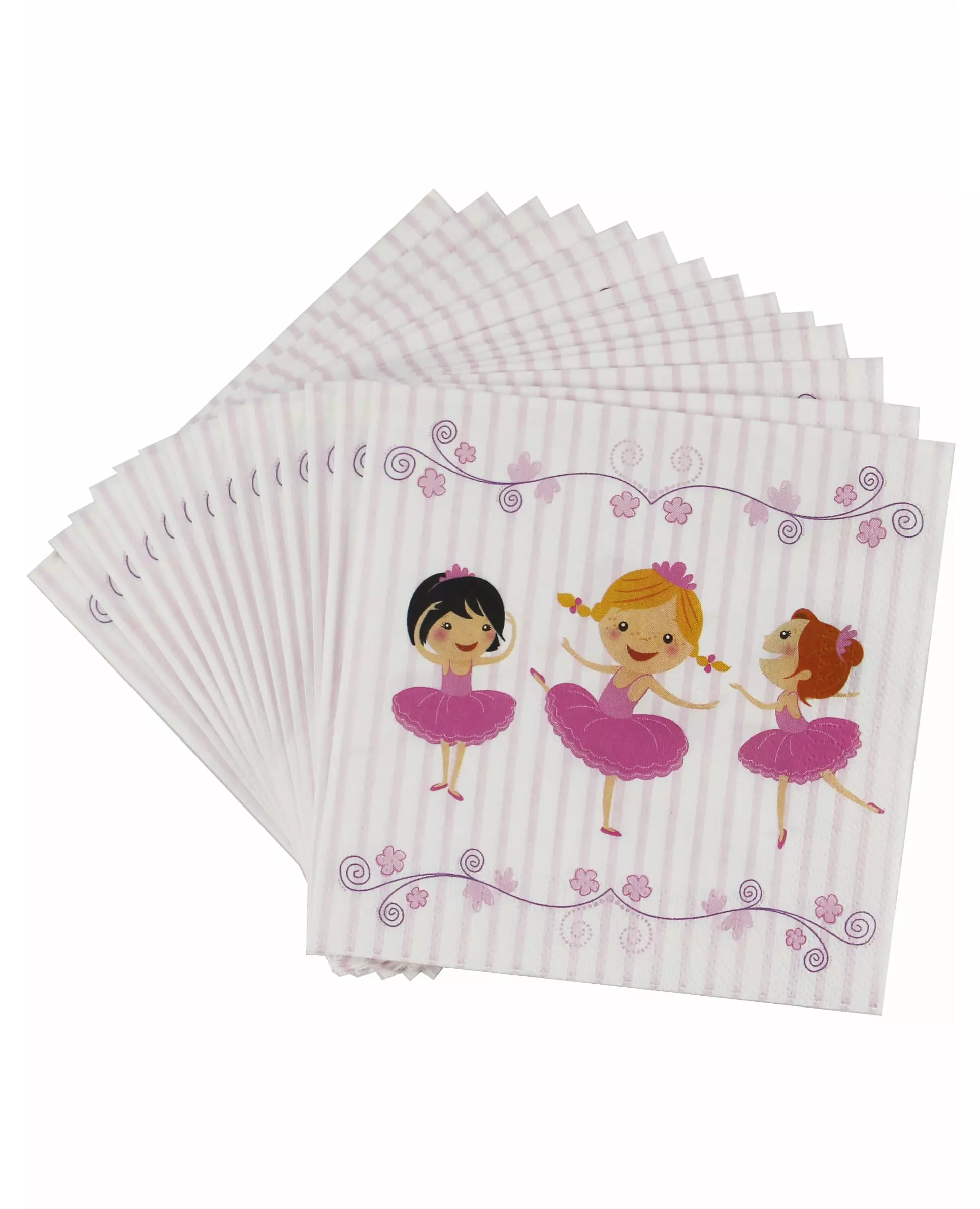 For et lite ballerinateselskap! Denne pakken inneholder 20 papirservietter med ballerinatema. De måler omtrent 16,5 x 16,5 cm lukket og 33 x 33 cm åpen. De er hvite med lyserosa striper og er dekorert med små blomster på toppen og bunnen. I midten er de trykt med tre små ballerinadansere. Disse engangsserviettene vil være perfekte for å fullføre bordet ditt til datterens bursdag! Inkludert tilbehør: 20 servietter Materiale: Papir