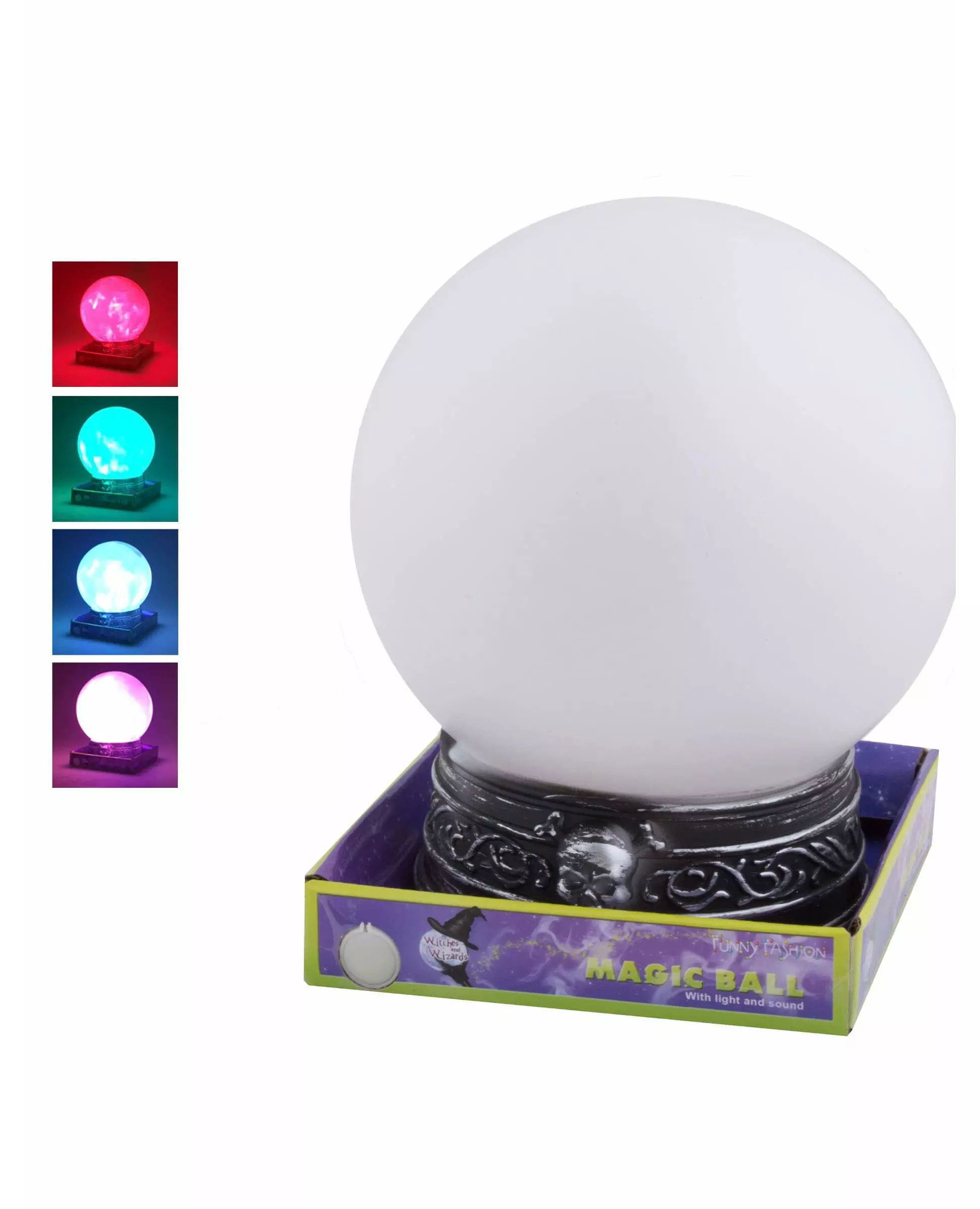 Krystallkule, hva er min fremtid? Denne magiske kulen er lysende og har lyd. Den måler omtrent 20 cm. Denne kulen har en base i gammelt sølvmetall med et hodeskallemotiv. Den er hvit og lyser i 4 forskjellige farger (rosa, lilla, grønn og blå). Og i tillegg til å sende ut lys, vil denne magiske kulen produsere skremmende Halloween-lydeffekter! Den fungerer med 3 AA-batterier. Denne kulen vil være ideell for å dekorere rommet ditt på en kveld med temaet klarsyn, hekseri eller til Halloween!. Inkludert tilbehør: lysende og lydkule Materiale: Plast