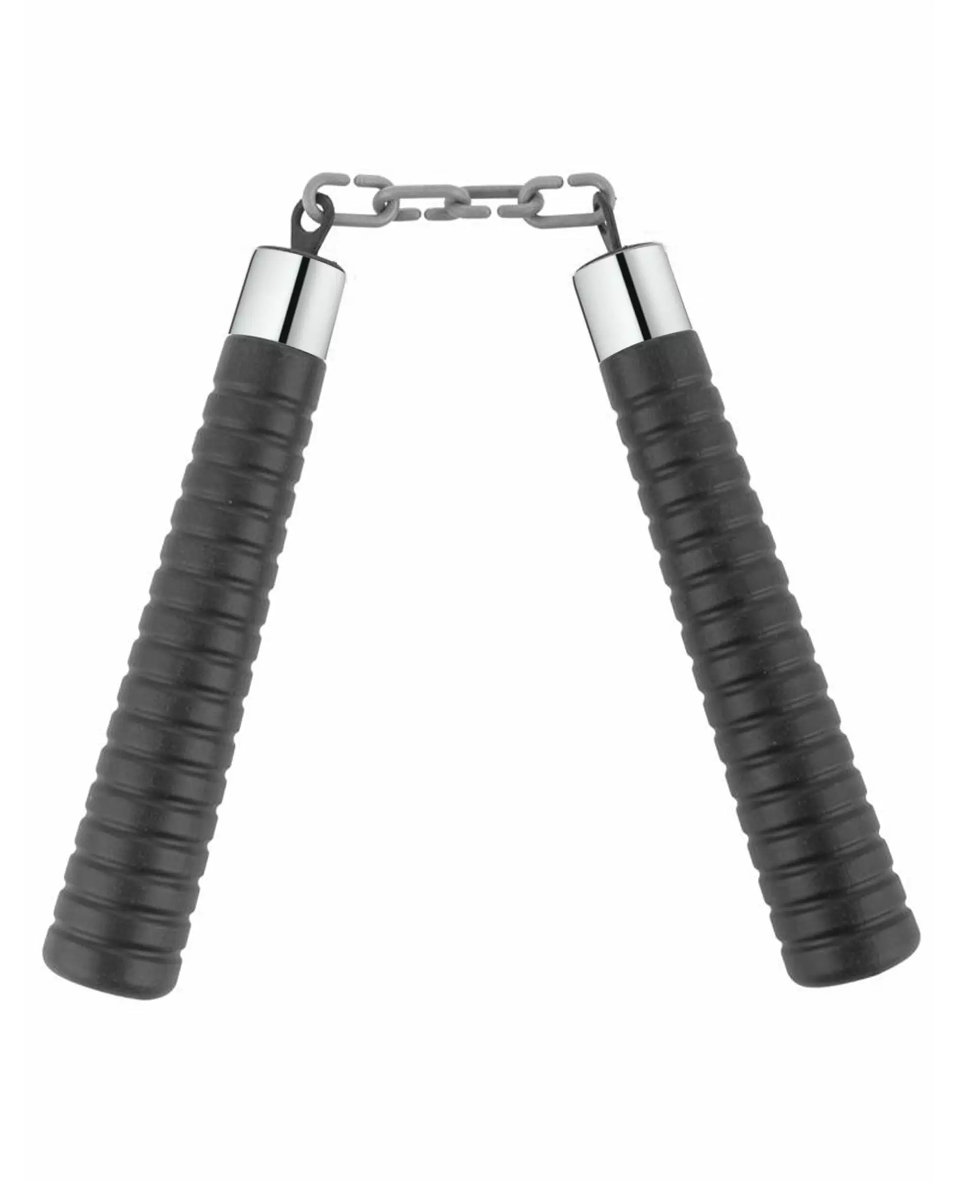 Bli en formidabel ninja. Denne ninja-nunchakuen i plast er svart. Den består av to svarte ermer og en kjede med rusten metalleffekt. Ermene måler omtrent 20 cm lange. Dette tilbehøret vil være det perfekte tillegget til ninjakostymet ditt til karneval eller under utkledningsfestene dine. Inkludert tilbehør: Nunchaku. Materiale: plast.