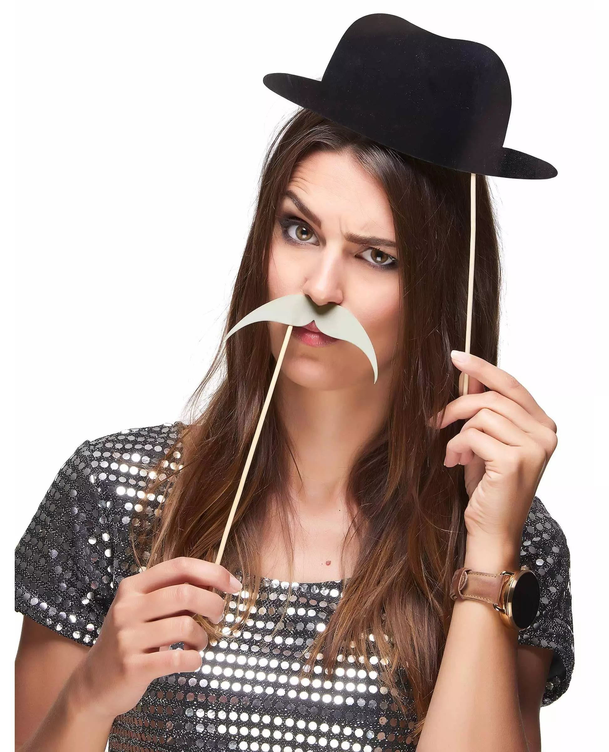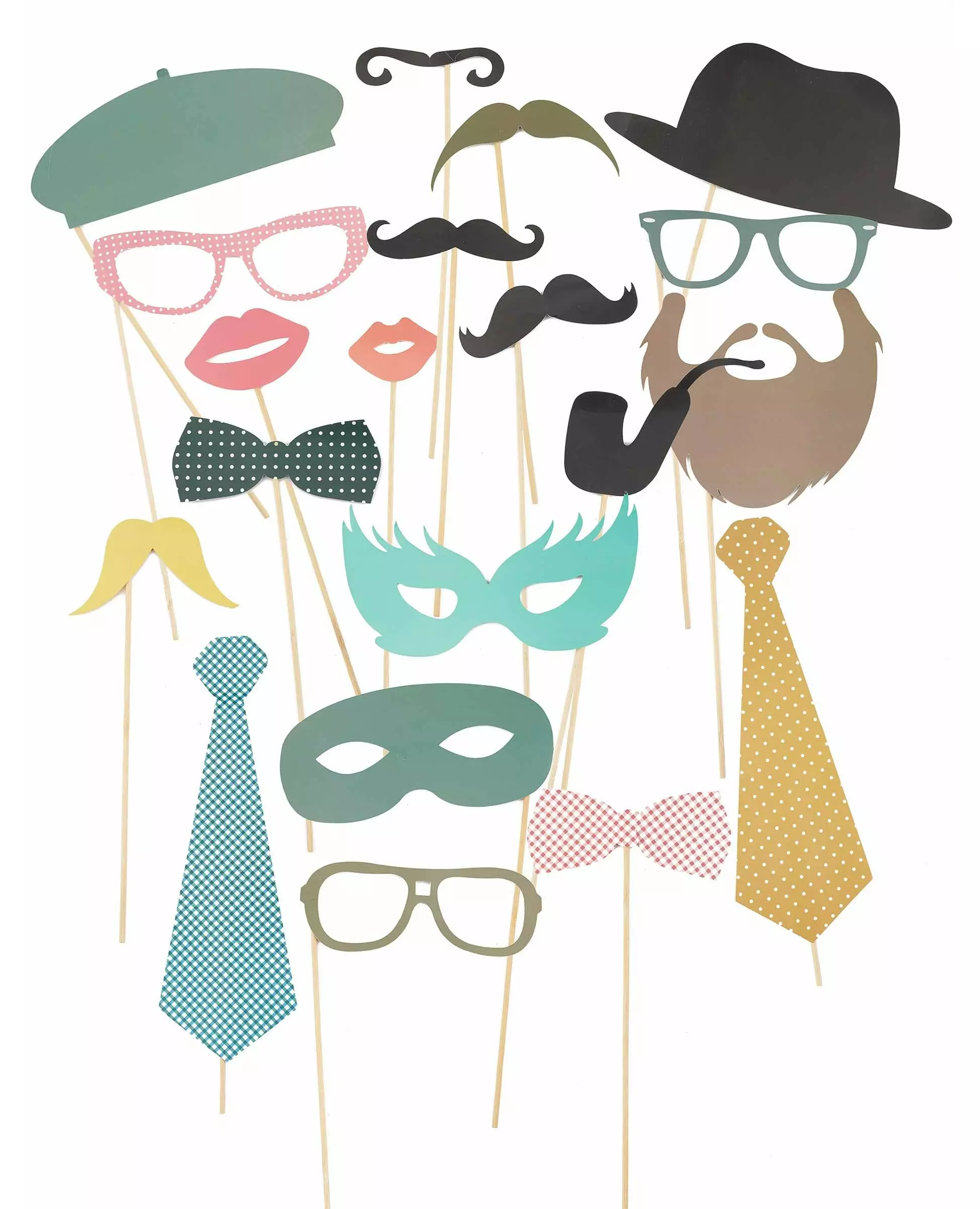 Det finnes noe for enhver smak! Dette fantastiske fotobokssettet med 20 deler inkluderer: - 3 par briller - 5 barter - 1 skjegg - 2 ulver - 2 slips - 2 sløyfer - 2 munner - 2 hatter - 1 pipe Settet er i svært trendy pastellfarger. Ideelt for et bryllup, en bursdag eller en hvilken som helst sammenkomst med vennene dine, for suvenirbilder fulle av moro. Inkludert tilbehør: 20 fotobokstilbehør Materiale: Papp og tre