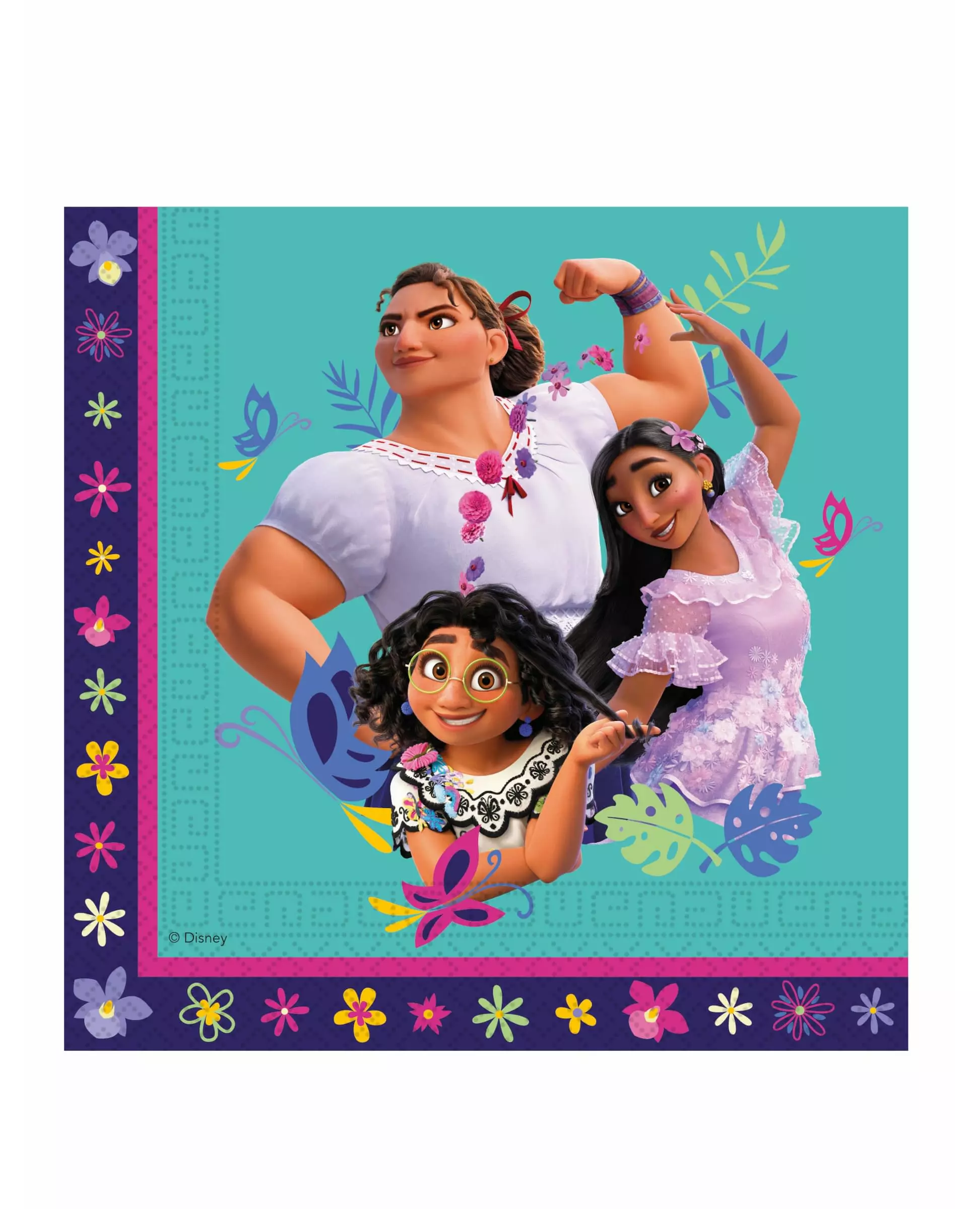 Den komplette Madrigal-klanen! Dette settet inneholder 20 offisielt lisensierte Encanto®-papirservietter. Hver serviett måler omtrent 33 x 33 cm. På en blå bakgrunn er de dekorert med figurer fra den berømte Encanto®-tegneserien. I midten finner du derfor figurene Mirabel, Isabela og Luisa, Madrigal-søstrene. Fullfør borddekorasjonen din til en bursdagsfest eller karneval! Inkludert tilbehør: 20 servietter Materiale: Papir