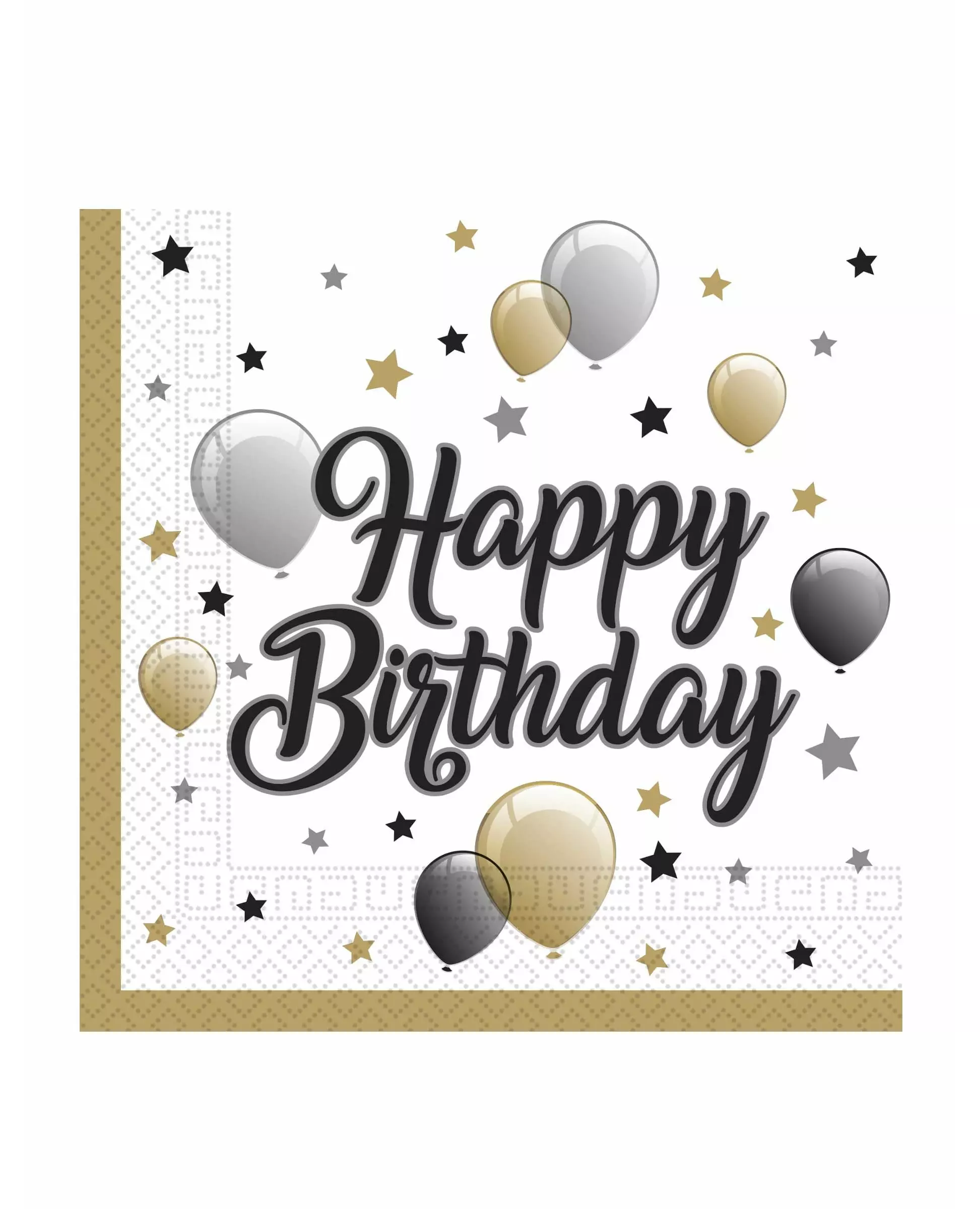 En munter bursdag! Denne pakken inneholder 20 papirservietter, hver omtrent 33 x 33 cm når de er utbrettet. De er hvite med gullkanter og har ordene «Gratulerer med dagen». Fine stjerne- og ballongmønstre i svart, sølv og gull fullfører designet. Disse serviettene er perfekte for å gi et snev av raffinement til bursdagsborddekorasjonen din. Inkludert tilbehør: 20 servietter Materiale: Papir