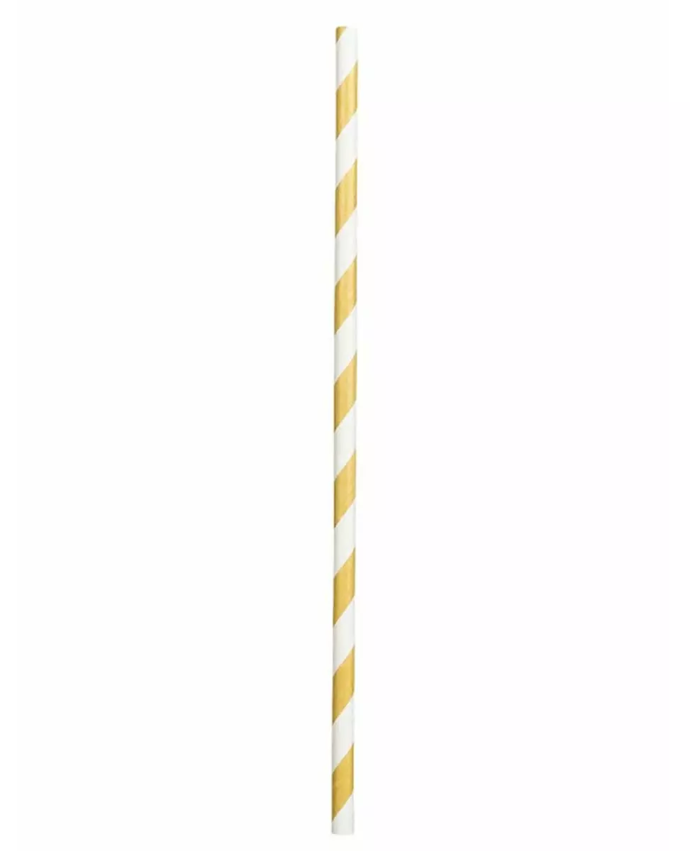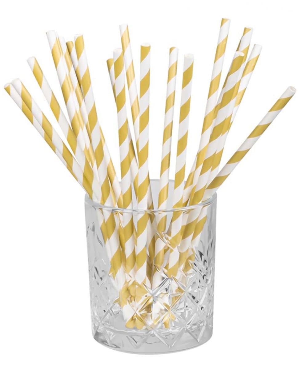 Gi drinkene dine litt gull! Disse pappsugerørene selges i pakker på 20. De måler omtrent 20 cm i lengden. De er dekorert med hvite og gullfargede striper. Disse gullfargede sugerørene er perfekte for å dekorere glass på bursdager, bryllup og babyshowers! Inkludert tilbehør: 20 sugerør Materiale: Papp