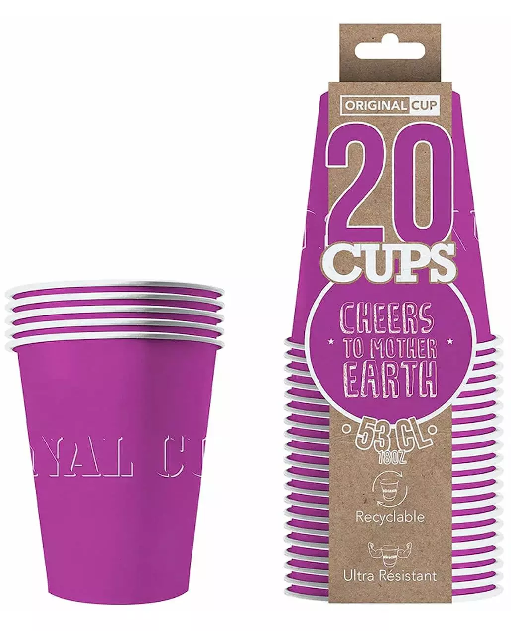 Sett farge på bordet med disse lilla koppene! Dette settet består av 20 kopper. De er laget av papp av høy kvalitet, men er også resirkulerbare. Lilla, de rommer omtrent 53 cl drikke. Hver kopp er trykket med ordene: «Original Cup». Disse lilla koppene vil være perfekte for å sette farge på festbordet ditt. Inkludert tilbehør: 20 kopper Materiale: Papp