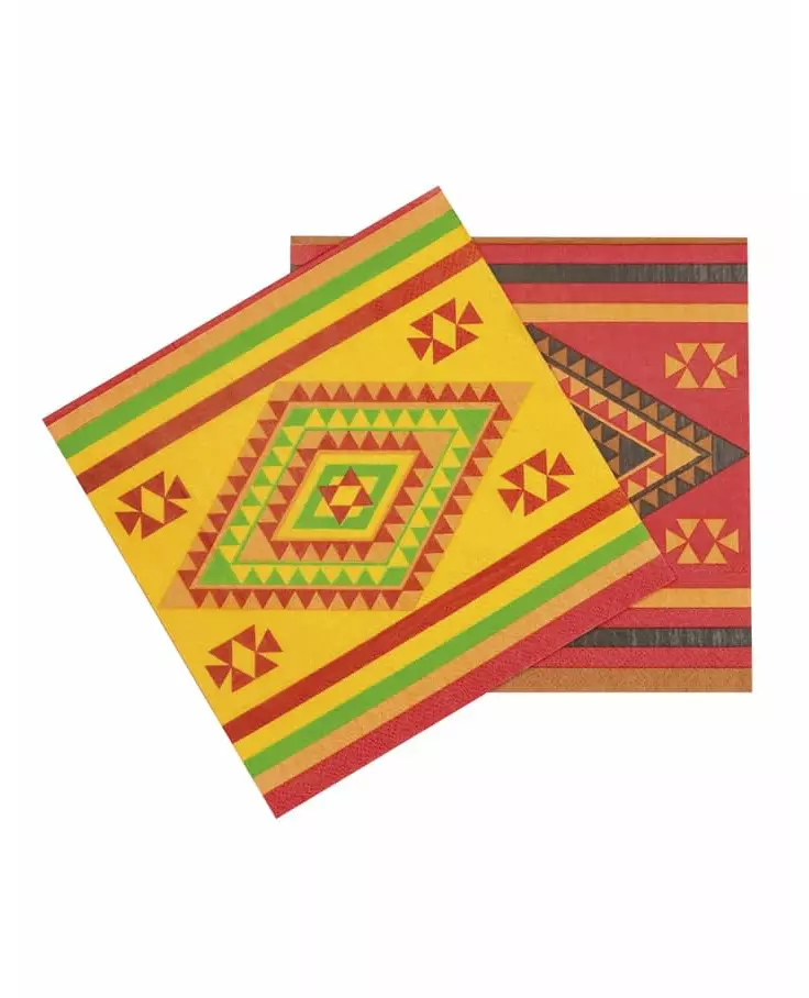 Papirservietter! Dette settet med 20 servietter er laget av papir. De er røde og gule, og er dekorert med mønstre. De vil være ideelle for å dekorere bordene dine under høytidsmåltidene. Materiale: papir