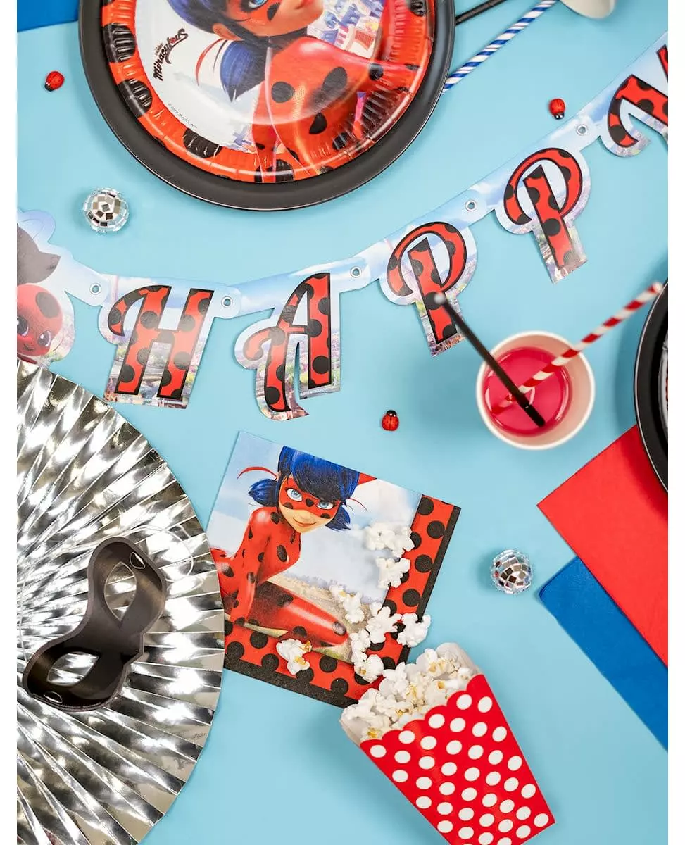 En perfekt marihønebursdag! Denne pakken inneholder 20 offisielt lisensierte Miraculous™ papirservietter. De måler omtrent 16,5 x 16,5 cm brettet sammen og 33 x 33 cm når de er utbrettet. Kantene er røde med svarte prikker som minner om marihøna, marihønens dyresymbol. I midten vil du beundre den berømte superhelten, vennen til Cat Noir. Fullfør bursdagsbordet ditt med disse engangsserviettene til barnets Miraculous™-bursdag!. Inkludert tilbehør: 20 servietter Materiale: Papir