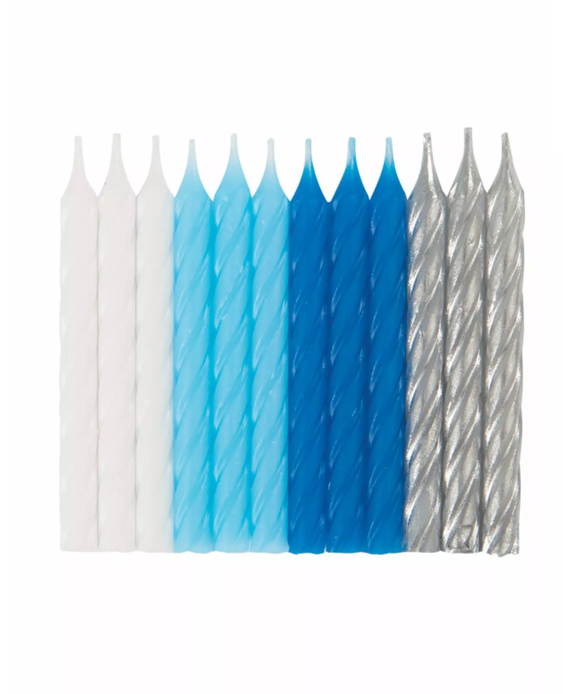 24 blå, hvite og sølvfargede bursdagslys 7 cm
