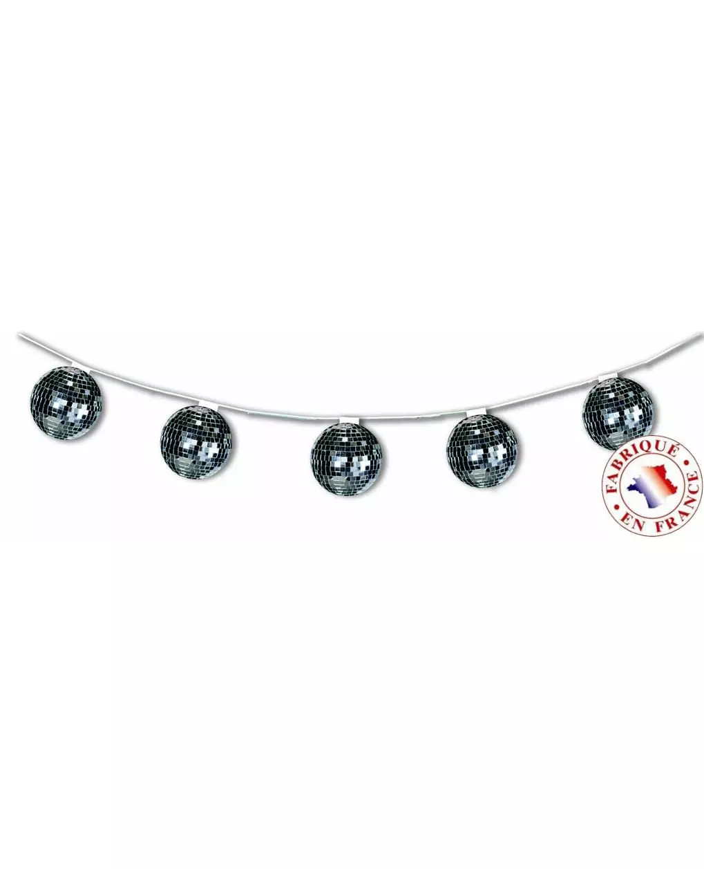 Få 70-tallet inn i festdekorasjonen din! Denne diskogirlanderen består av 8 speilkuler. Den måler 3,20 meter i lengden. Speilkulene er laget av papir og måler 17 cm i diameter. Denne dekorasjonen vil være perfekt for en diskobursdag eller en temafest. Denne girlanderen er laget av flammehemmende materiale og er laget i Frankrike. Inkludert tilbehør: Girlander Materiale: Papir