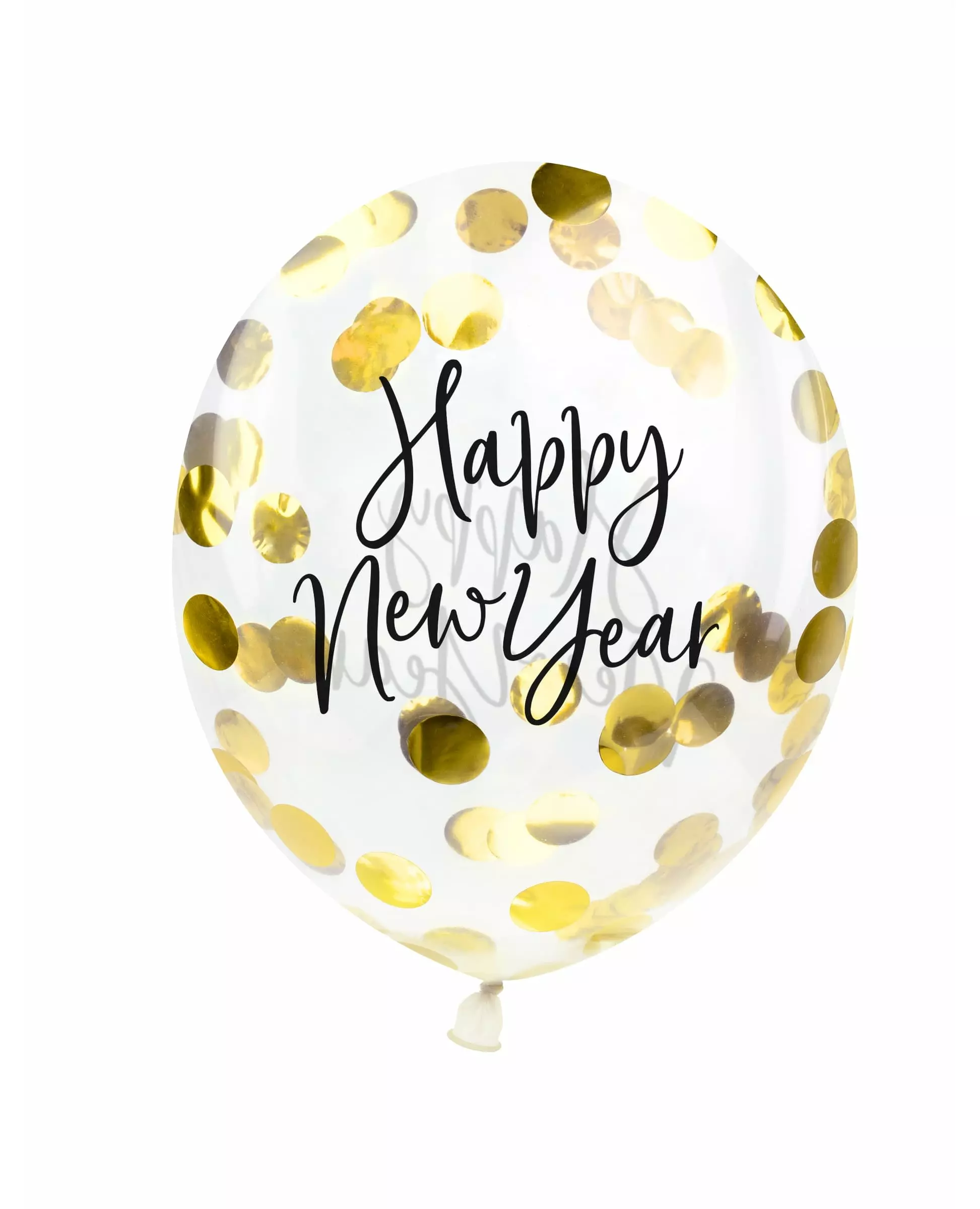 3 gullfargede konfetti-latexballonger med godt nyttårsmotiv, 27 cm