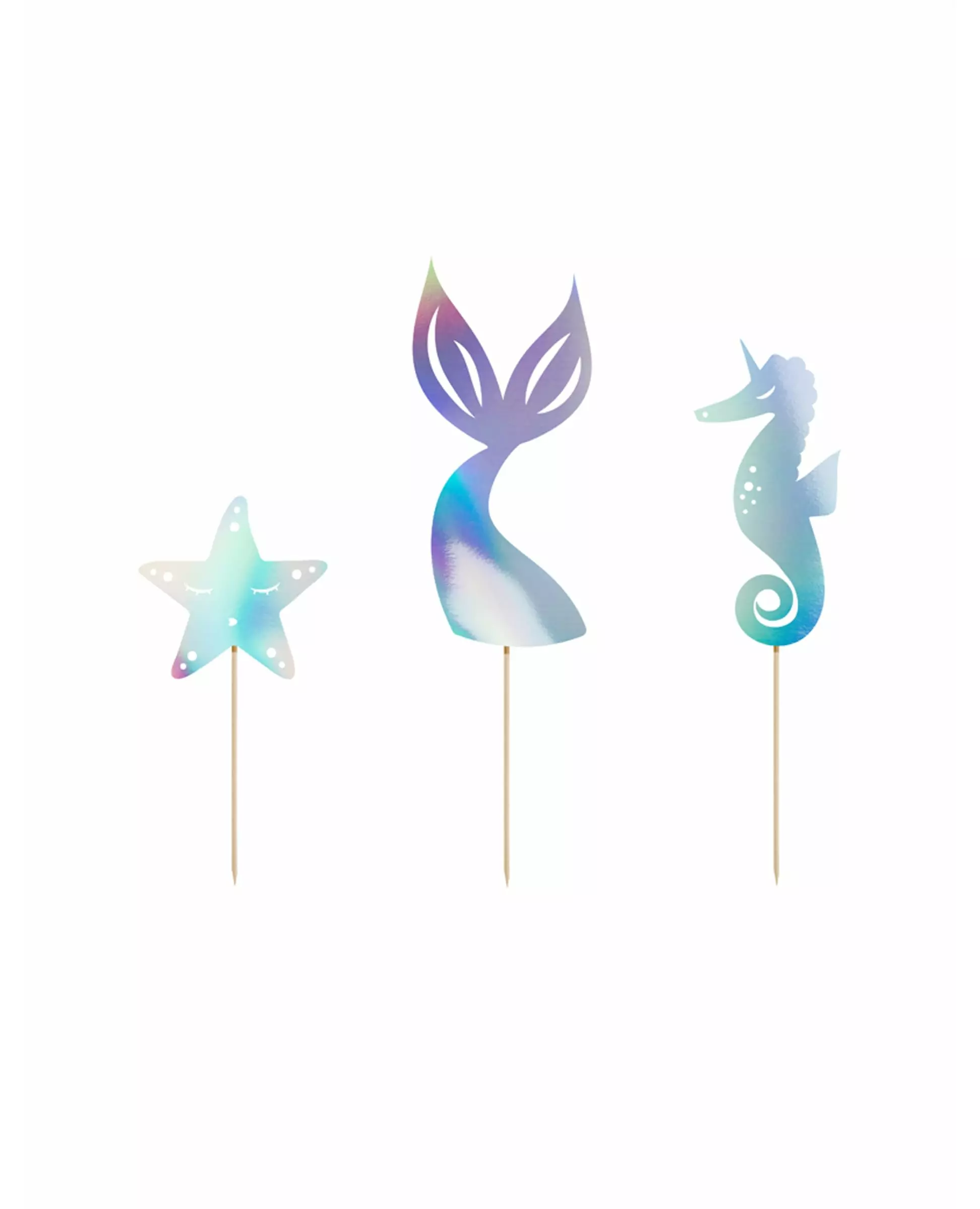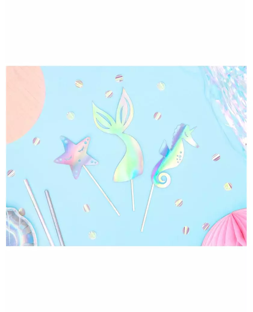 For cupcakes fra havet! Dette settet inneholder 3 holografiske havfrue-kaketopper. Hver måler omtrent 24,5 cm i lengde. Hver kaketopper er iriserende i nyanser av blått og lilla. Én representerer en havfruehale, en annen en sjøhest og den siste en sjøstjerne. Disse kaketoppene vil være perfekte for å dekorere muffins og andre cupcakes til en havfruetema-bursdag. Inkludert tilbehør: 3 kaketopper