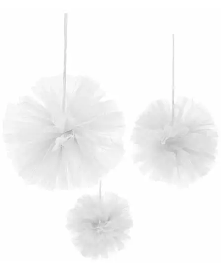 3 hvite tyllhengende pomponer 15, 20 og 30 cm