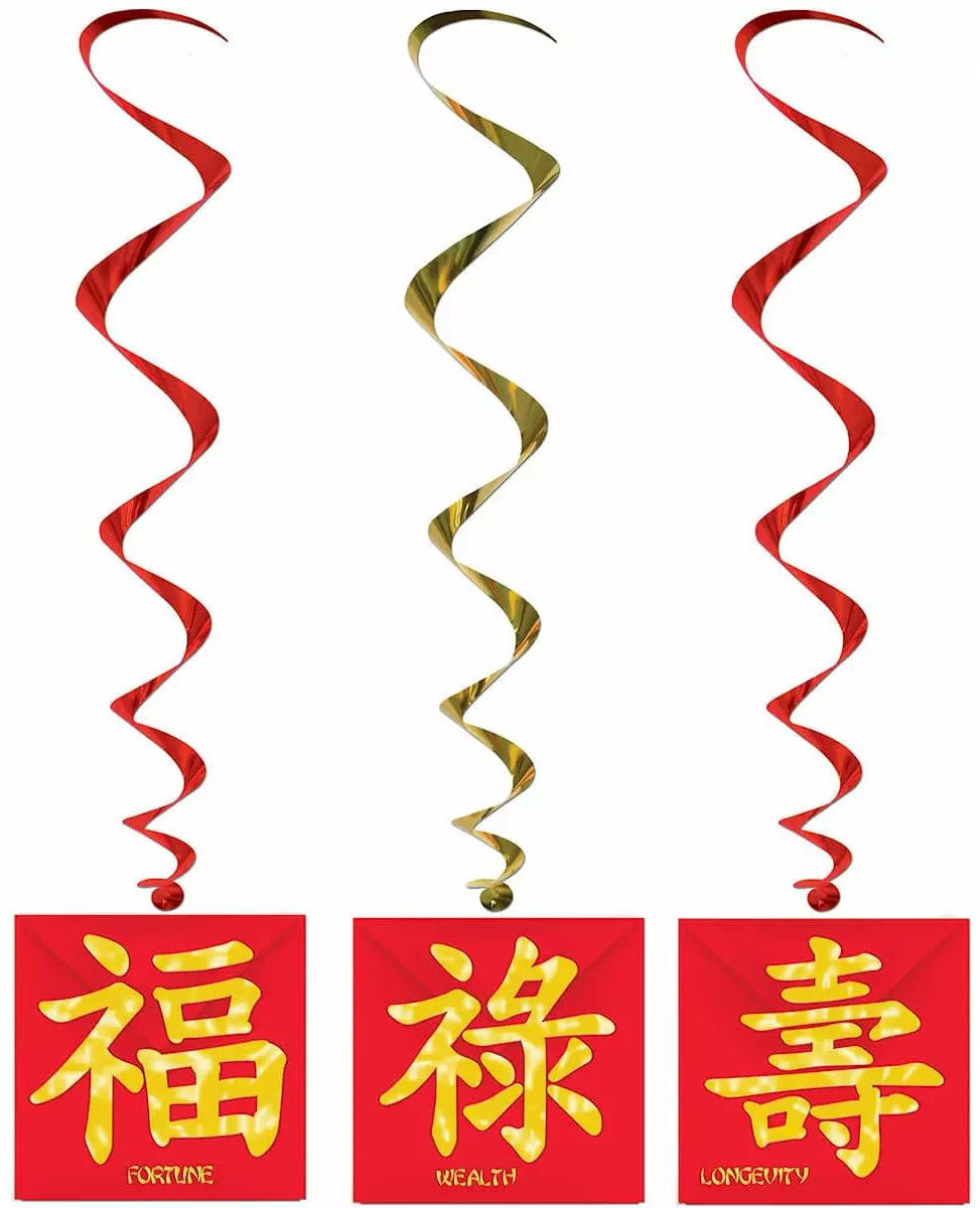 Dekorer rommet ditt med Asias farger! Dette settet består av tre spiralformede anheng. Hvert anheng måler 102 cm og er rødt eller gullfarget. Et firkantet klistremerke med kinesisk kalligrafi er festet. Denne dekorasjonen vil være ideell for å dekorere interiøret ditt til kinesisk-tema fester eller til kinesisk nyttår. Inkludert tilbehør: 3 anheng Materiale: Plast