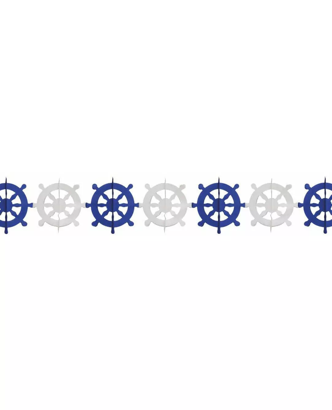 Ta med sjømennene til temafesten din! Denne utbrettbare papirgirlanderen danner blå og hvite ror. De måler omtrent 21,5 cm i diameter. Denne girlanderen måler omtrent 3 m i lengden og er laget av flammehemmende papir. Denne girlanderen vil være perfekt for å fullføre en sjøtema-dekorasjon til en bursdagsfest eller andre festlige arrangementer. Copyright Widmann SRL. Inkludert tilbehør: Sjømannsgirlander Materiale: Papir