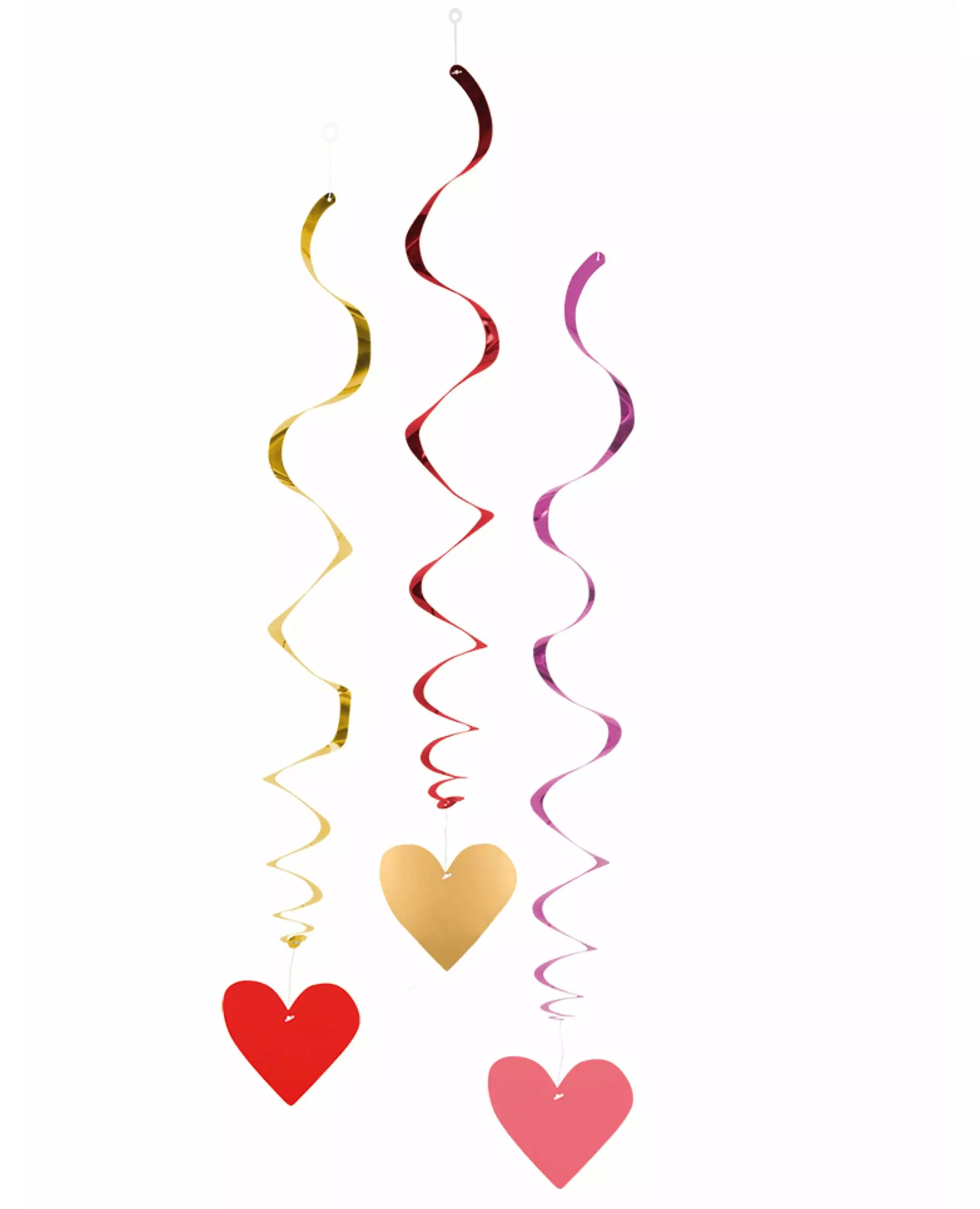 Jeg elsker deg! Disse tre spiralformede opphengsdekorasjonene måler 85 cm. De er flerfargede og metalliske med et hengende hjerte. De vil være perfekte til Valentinsdagen eller et bryllup. Inkludert tilbehør: 3 spiraler Målinformasjon: 85 cm