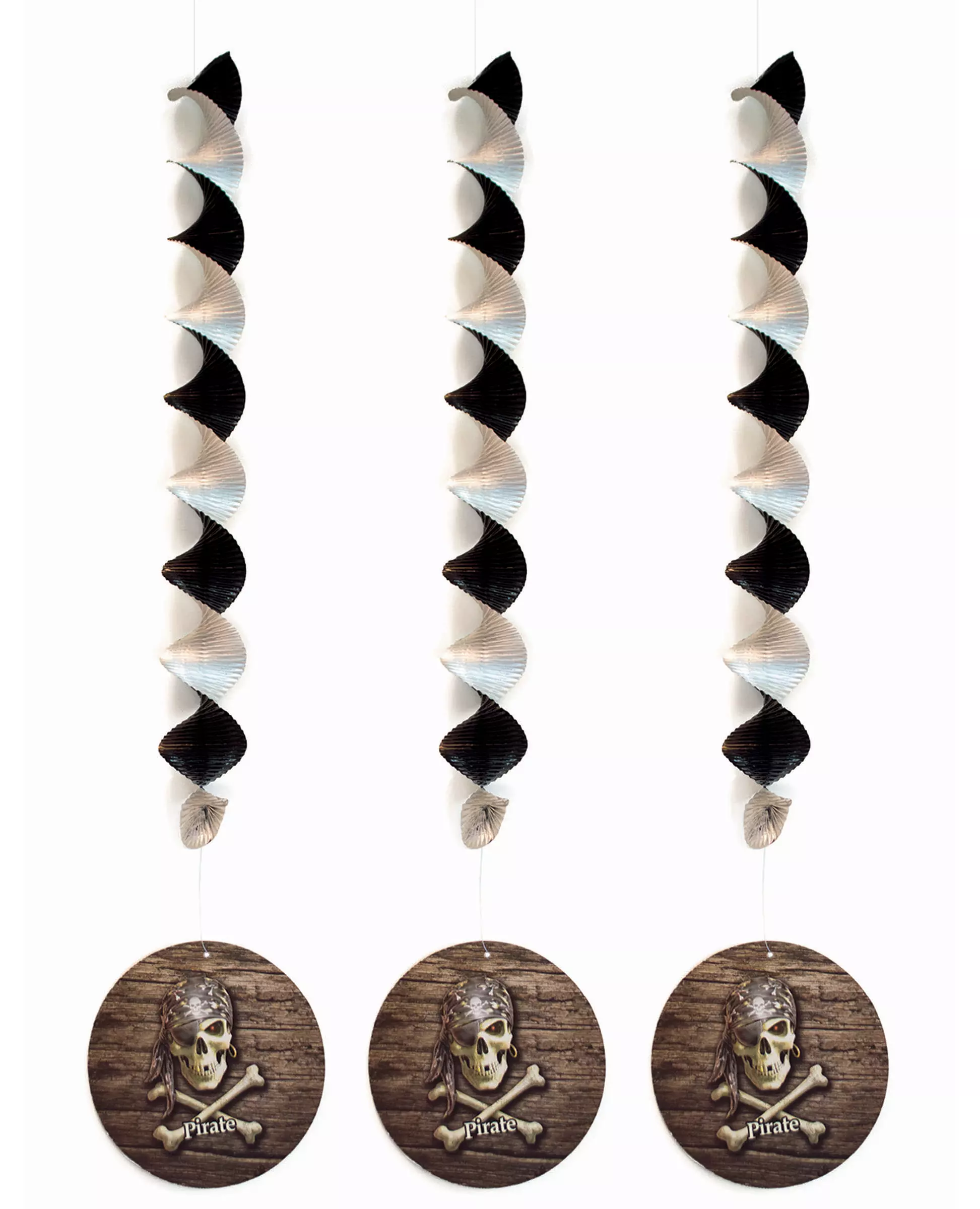 Skap en ekte piratstemning med disse hengende dekorasjonene. Dette settet består av 3 hengende piratdekorasjoner. Hver dekorasjon består av en svart og sølvfarget metallisk spiral, som et pappklistremerke er festet til. Disse runde klistremerkene måler omtrent 13 cm i diameter. De er trykt på begge sider med et tremønster med en piratskalle. Disse hengende dekorasjonene måler omtrent 81 cm i lengde når de er utbrettet. De har en liten plastkrok for enkel opphenging. De vil være perfekte for å fullføre romdekorasjonen din. til en pirattema-bursdagsfest. Tilbehør inkludert: 3 hengende lys