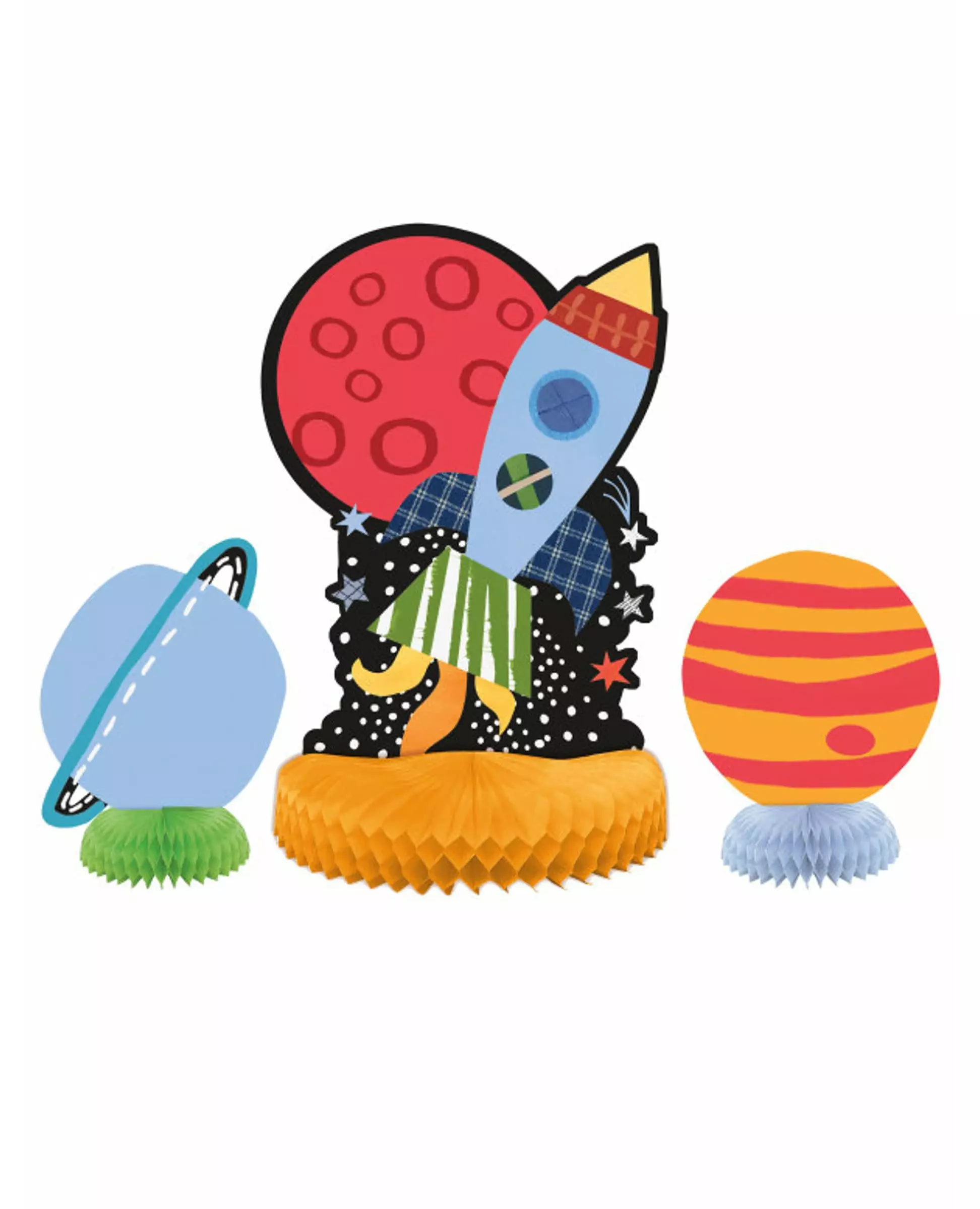 Bordet ditt vil reise ut i verdensrommet! Dette settet inneholder 3 borddekorasjoner. De er laget av papp og bikakepapir. Det største måler omtrent 35 cm og representerer en rakett og en planet. De to mindre måler omtrent 15 cm og representerer planeter. Pynt bordet ditt med disse borddekorasjonene til en bursdag i verdensrommet! Inkludert tilbehør: 3 borddekorasjoner Materiale: Papp, bikakepapir