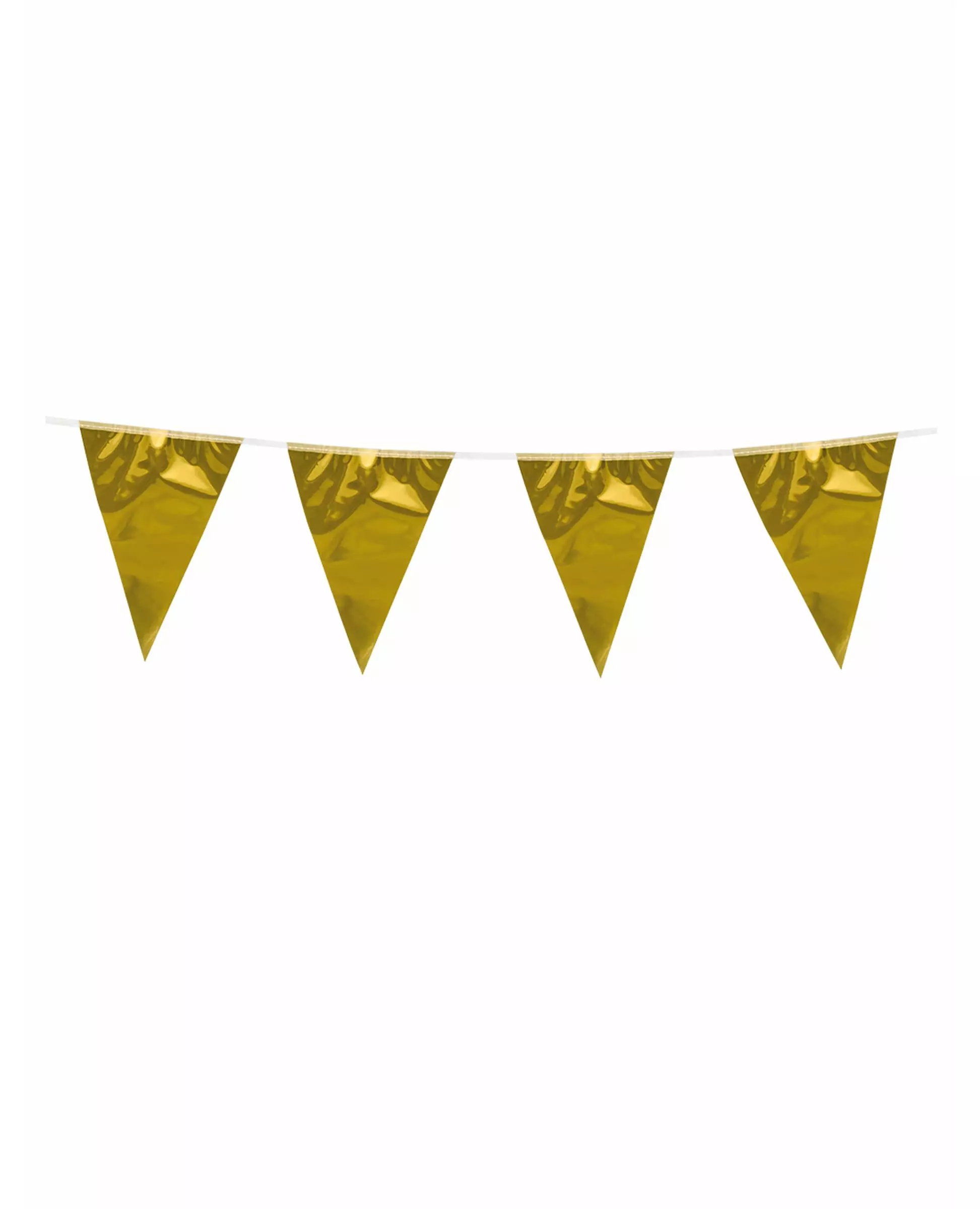En elegant gullfarget dekorasjon! Denne girlanderen av små plastvimpler måler nesten 300 cm i lengde. Den er laget av små gullfargede plastvimpler. Du kan sette den utendørs uten bekymringer. Den vil være perfekt som dekorasjon i gyldne toner til for eksempel en bursdag eller et bryllup! Inkludert tilbehør: 1 girlander Materiale: Plast