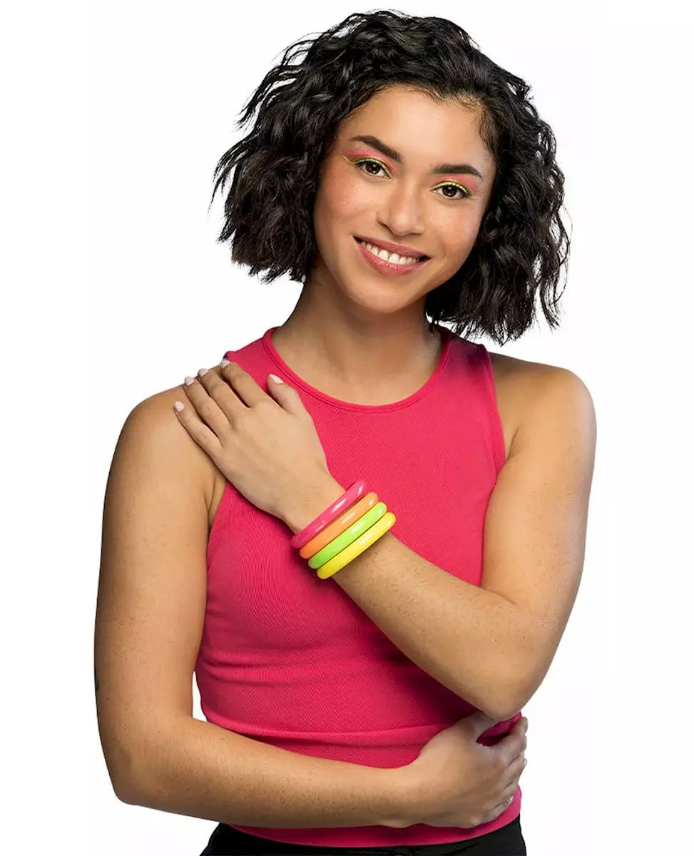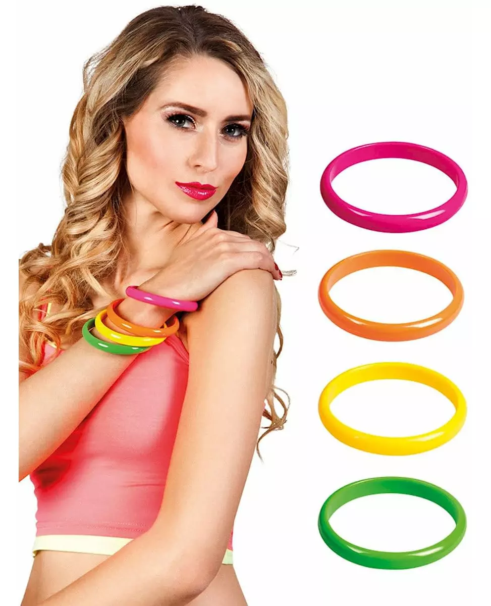 Med disse armbåndene inviteres 1980-tallet inn i antrekket ditt! Dette settet består av 4 80-tallsarmbånd. De er laget av plast i rosa, oransje, gult og grønt. Dette settet er perfekt for å fullføre ethvert 80-tallskostyme. Inkludert tilbehør: 4 armbånd Materiale: Plast Stell: Håndvaskbar