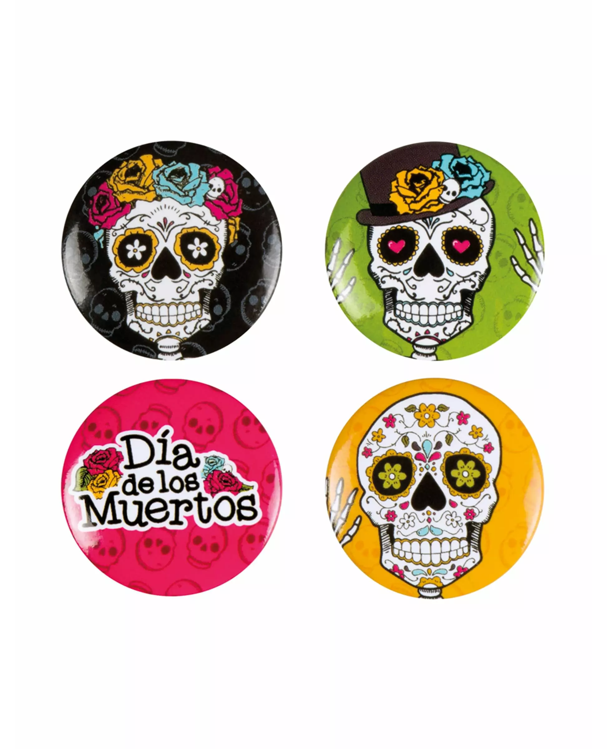 Personaliser tilbehøret ditt med disse fargerike nålene. Dette settet består av 4 merker med temaet De dødes dag. De måler omtrent 3 cm i diameter. 3 av disse merkene representerer en hodeskalle med blomster- og fargerike mønstre, på en svart, oransje og grønn bakgrunn. Den siste nålen representerer budskapet «Dia de los muertos» på en rosa bakgrunn med hodeskaller. Disse merkene vil være perfekte for å personliggjøre antrekket eller tilbehøret ditt til Halloween!. Inkludert tilbehør: 4 merker Materiale: Plast og metall