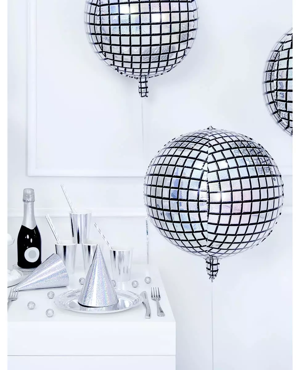 Finn frem speilkulen til en discofest! Denne runde ballongen er laget av aluminium. Den forestiller en speilkule på omtrent 40 cm. Du kan blåse den opp med luft eller helium for å få den til å fly. Denne speilkuleballongen vil være et uunnværlig tilbehør til discodekorasjonen din. Inkludert tilbehør: 1 ballong Materiale: Aluminium