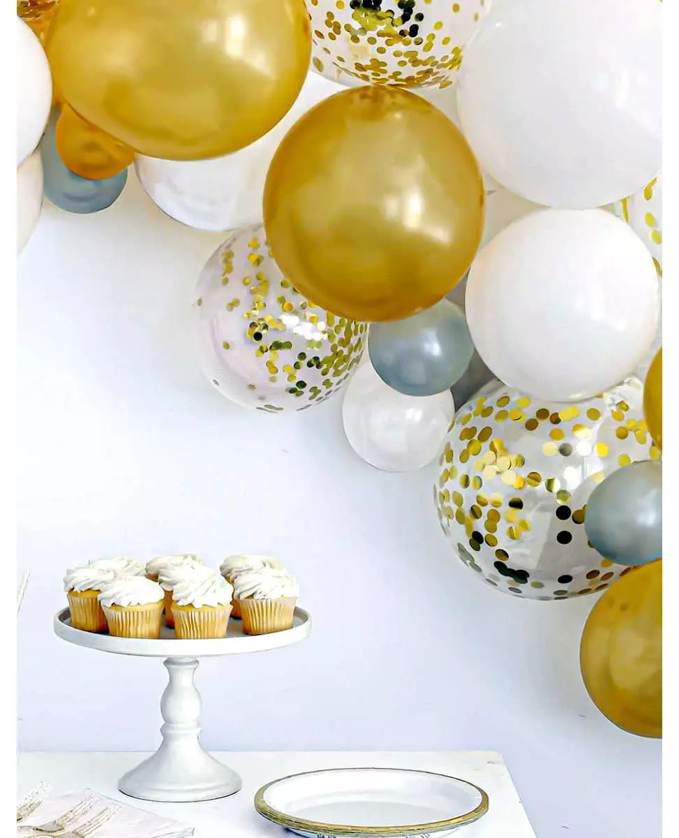 40 hvite og gullfargede ballongbuer med konfetti